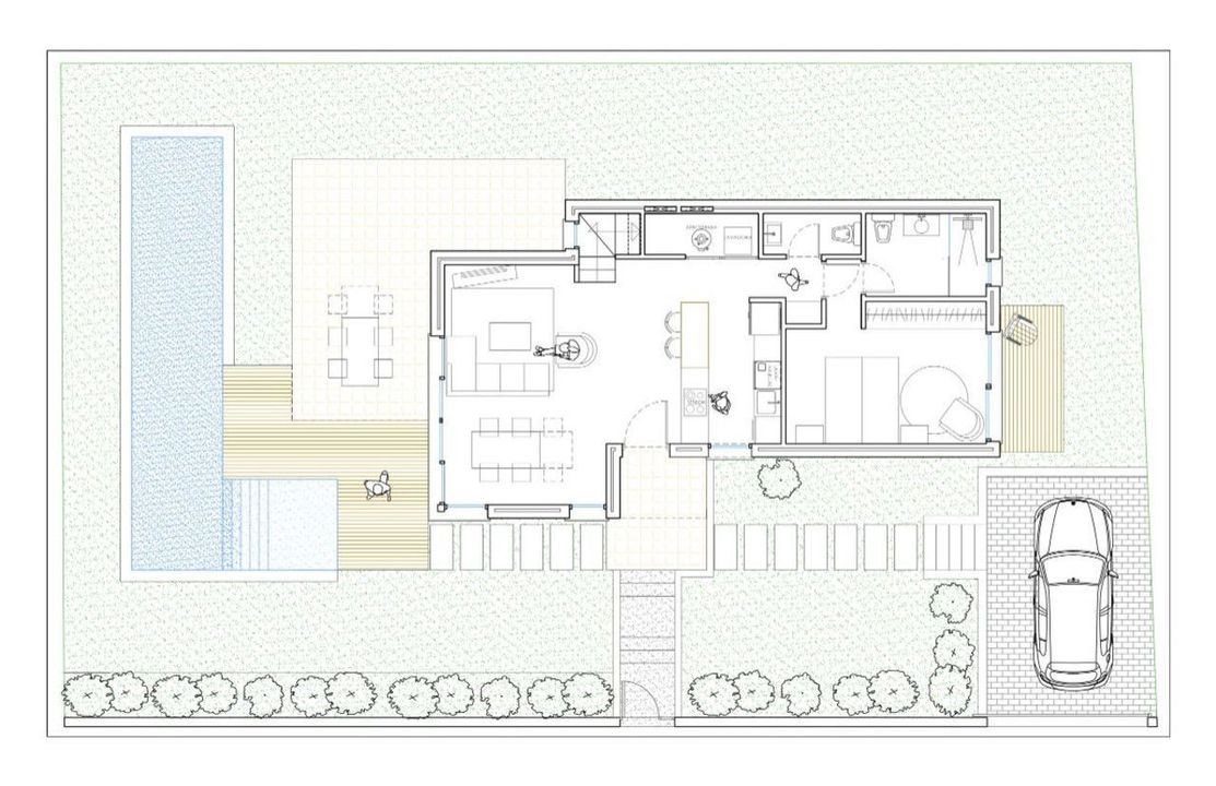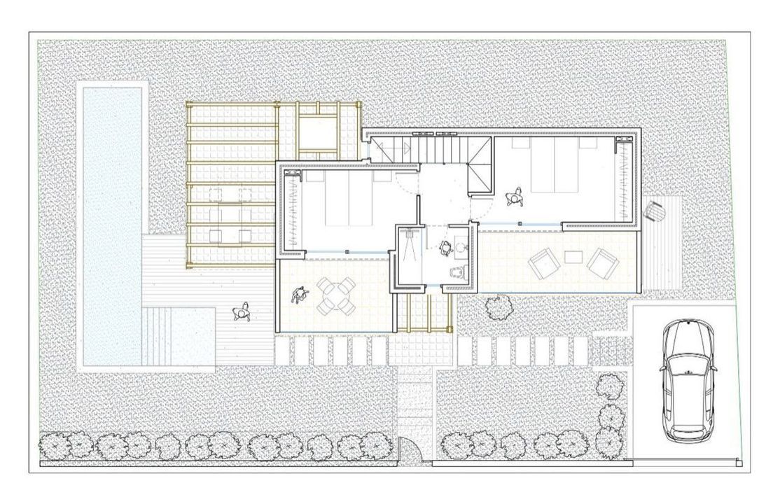 De villa is doordacht ingedeeld over twee verdiepingen, met op de benedenverdieping een ruime en lichte leefruimte die uitkijkt op het terras en zwembad. Strakke, hedendaagse lijnen zijn overal terug te vinden. De witte binnendeuren en ingemaakte kasten in aangepaste stijl zorgen voor een serene eenheid in het interieur. Grote aluminium ramen met hoogrendementsglas zorgen voor veel natuurlijk licht en een harmonieuze verbinding tussen binnen en buiten.