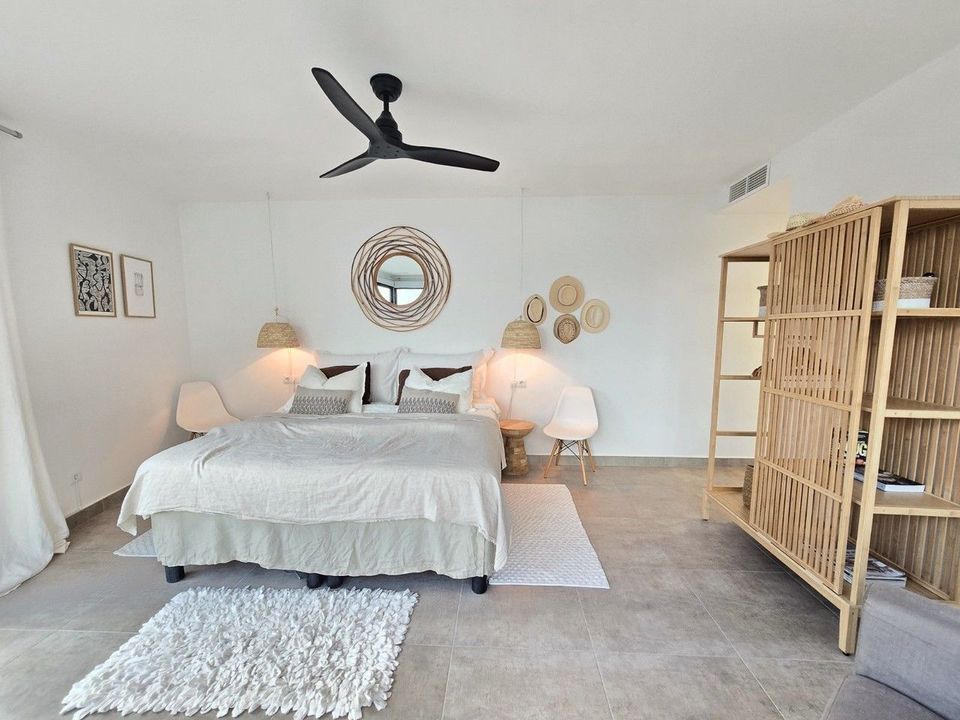 De bovenverdieping beschikt over een volledig gerenoveerde keuken in Scandinavische stijl die uitkomt op een ruime, lichtrijke woonkamer. Grote schuifpuien verbinden het interieur met het zonnige terras en creëren een moeiteloze binnen-buiten levensstijl.