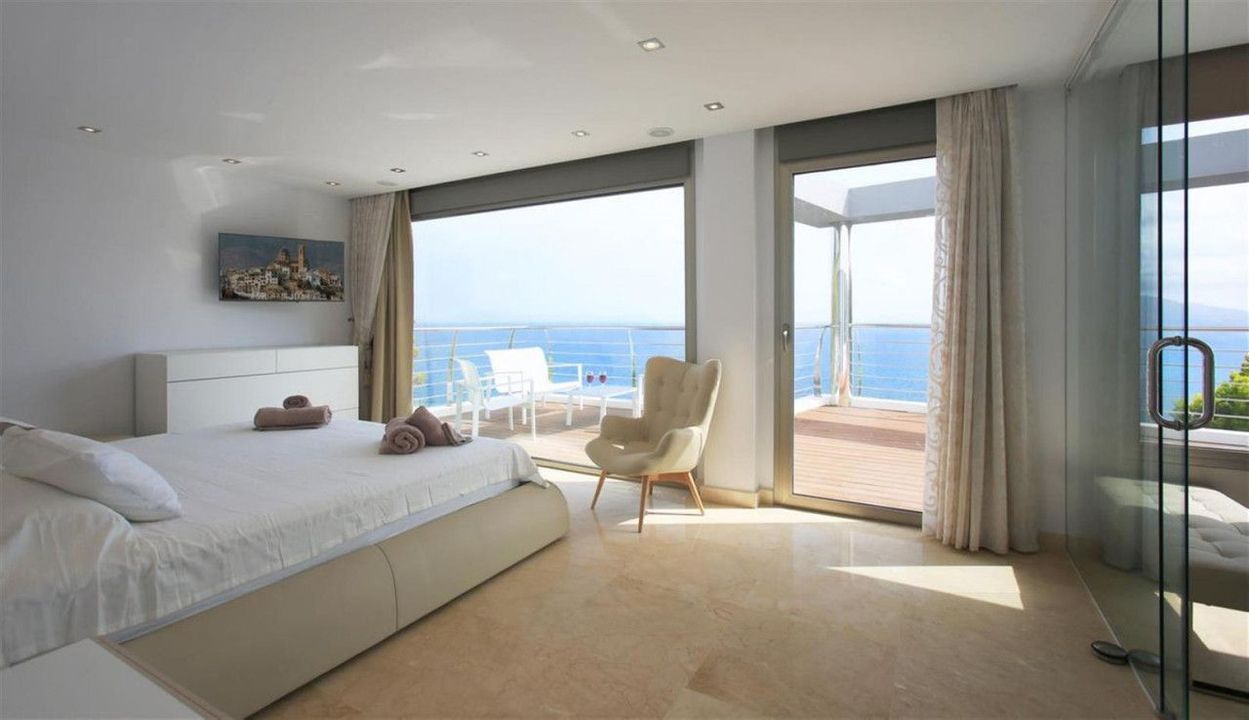 De villa is gebouwd over 2 niveaus, binnen is de woon-eetkamer die verbonden is met het terras door grote glazen schuifdeuren. Het zorgt ook voor veel licht in huis. Naast de woonkamer is een mooie open keuken, de villa heeft in totaal 6 slaapkamers en 6 badkamers, en er is ook een bioscoopzaal in de villa. Op de begane grond is er ook een kleine keuken, een slaapkamer, een badkamer en een woon-eetkamer voor de gasten.Boven zijn er terrassen met zeezicht vanuit de slaapkamers om van de speciale momenten te genieten en te ontspannen.