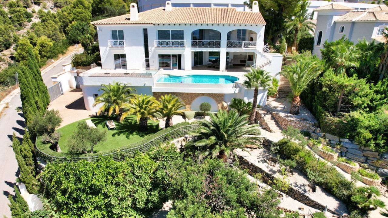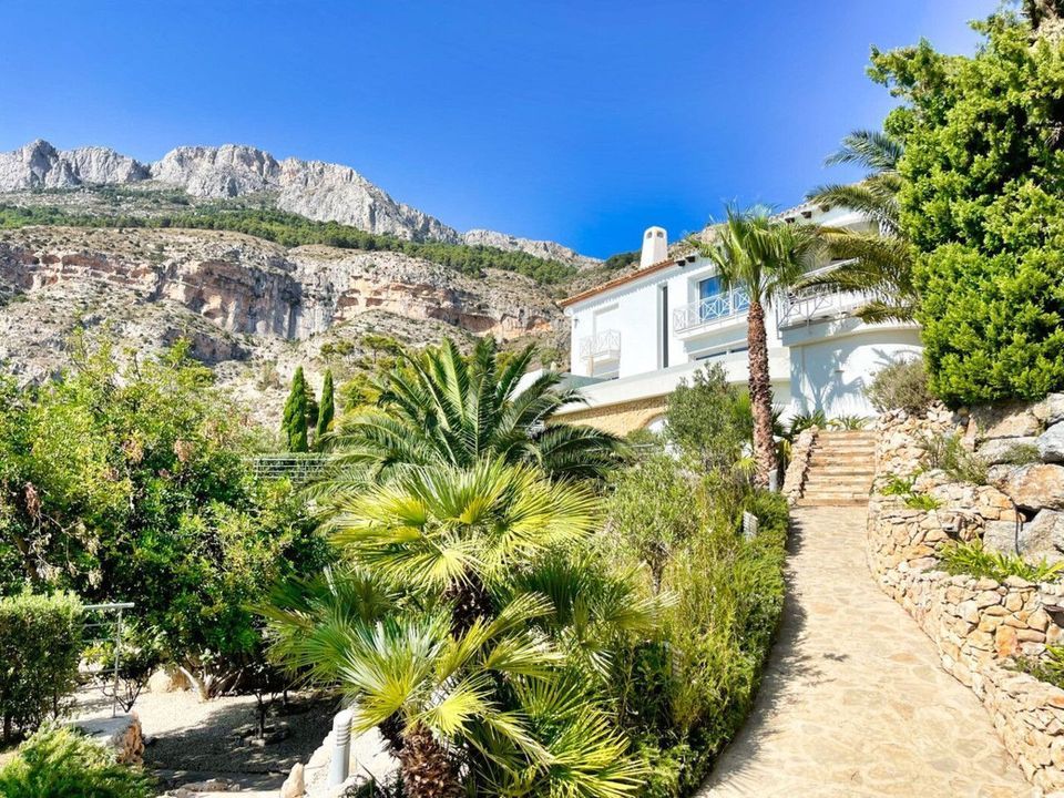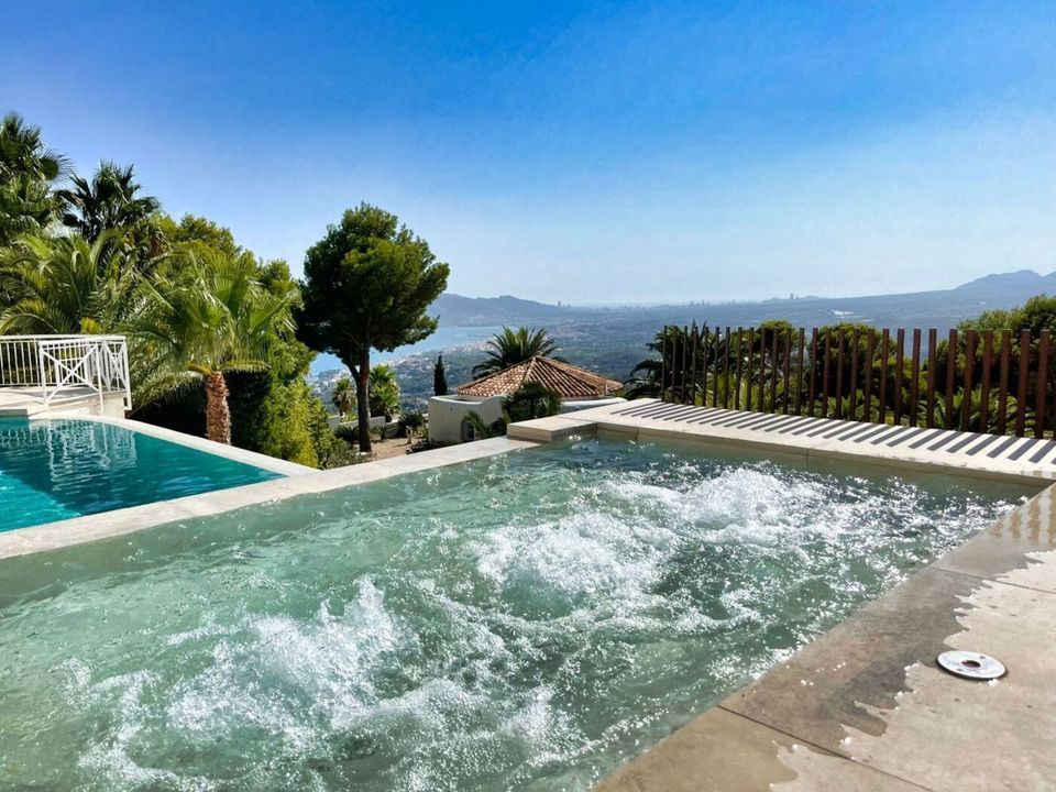 Luxe villa gelegen in de Sierra de Altea, met zeven slaapkamers, een gastenverblijf, panoramisch uitzicht op zee en de bergen, rust en privacy.