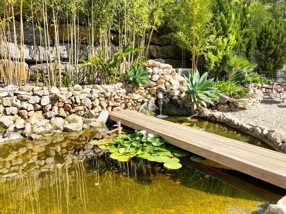De luxe villa is omgeven door een perceel van 2440 m2, aangelegd, omheind en perfect gemanicuurd, met een verscheidenheid aan bloemen, volwassen planten en een spectaculair uitzicht.