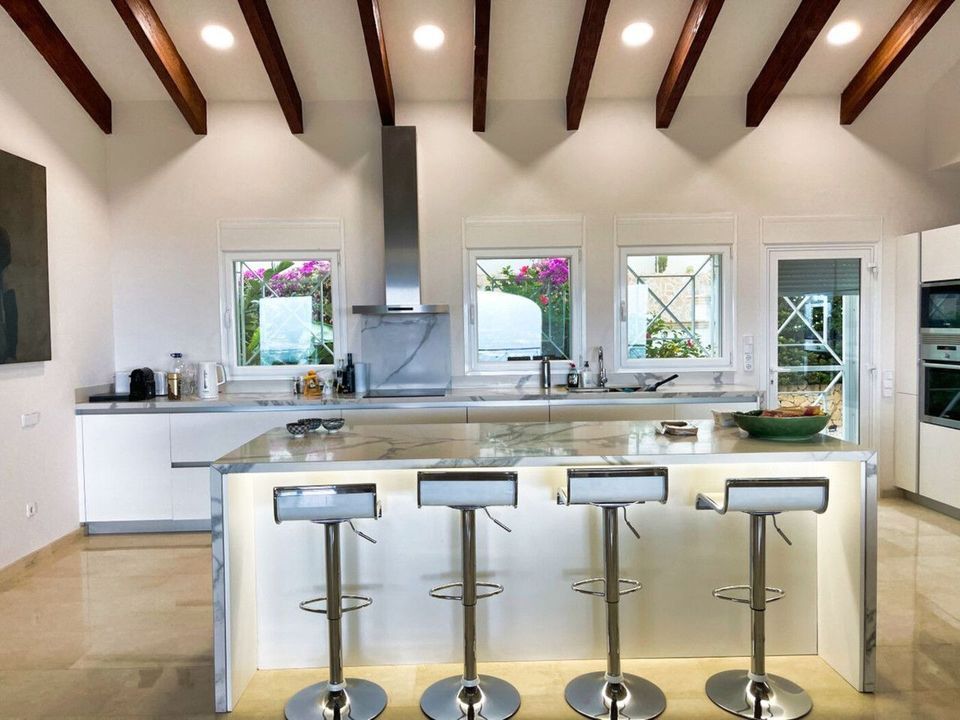 Je zult ook de hoge balkenplafonds opmerken en de harmonie van edele en natuurlijke materialen in de hele villa.