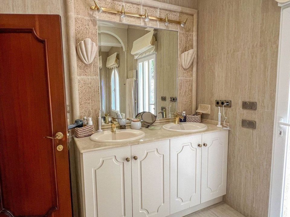 The property welcomes you in the entrance hall, leading to an inviting light and bright dining room and a spacious comfortable living room with a log burner, both the lounge and diner with beautiful peaceful green views which link on to a mesmerising seaview. There is a beautiful well-equipped kitchen with a large separate laundry area and guest wc.. Ths ideal property features 3 bedrooms( the smaller one at present used as an office), each with its own en-suite bathroom, . The terraces, both covered and open-air, offer panoramic views of the captivating Mediterranean Sea, the villas beautiful gardens and its attractive pool area.