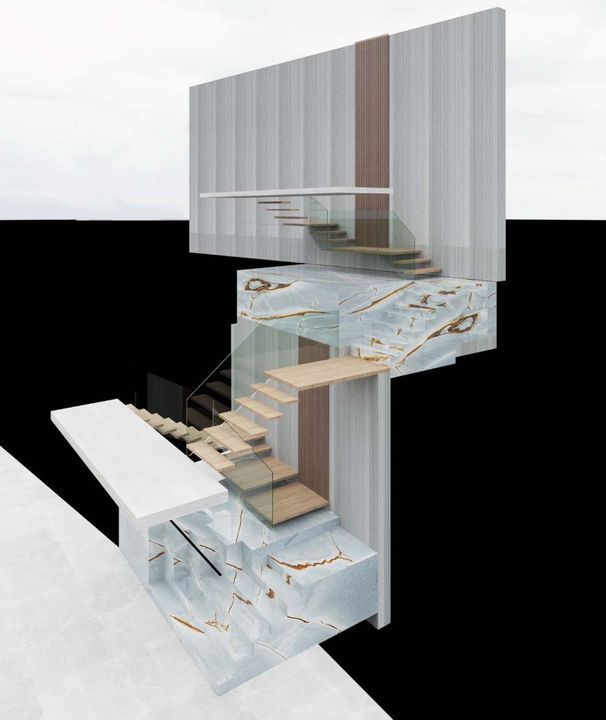 Niveau 3: master bedroom met twee walk‑in closets, badkamer met douche en ligbad, en apart toilet. Woonkamer verbonden met eetkamer en keuken, met daarachter een grote voorraadkast. Alle ruimtes op deze verdieping hebben ruitwanden; de hal heeft een gastentoilet.