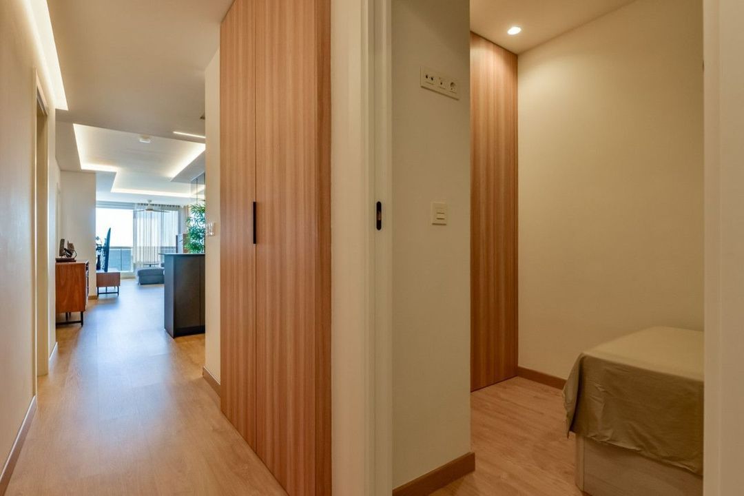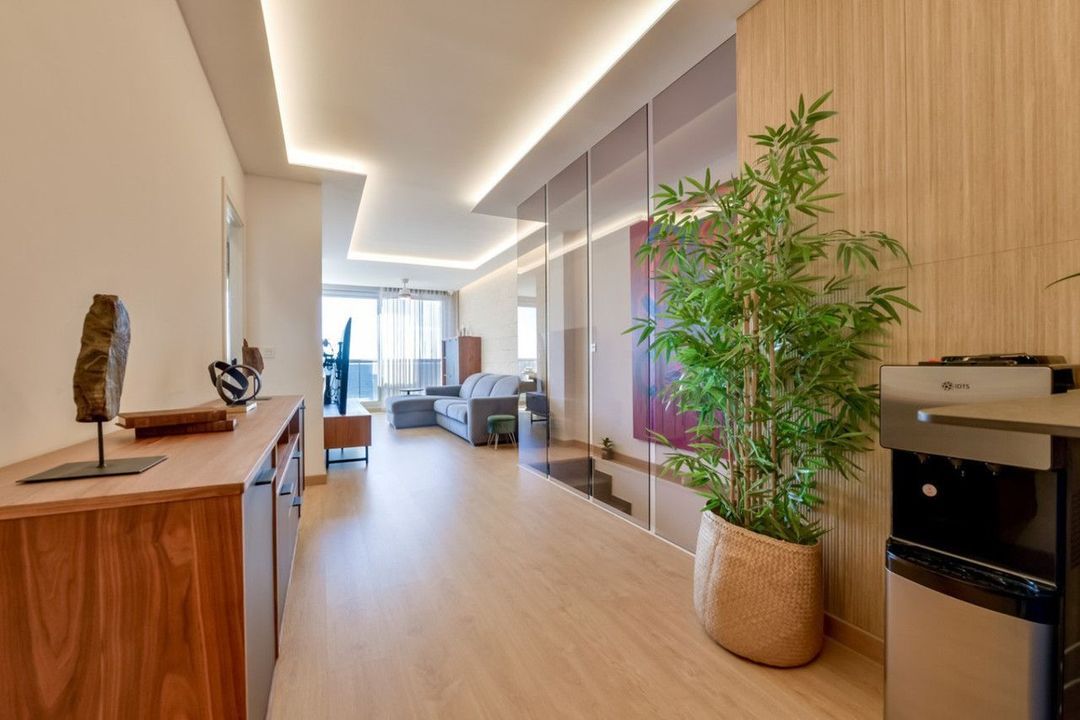 Op de hoofdverdieping bevindt zich een ruime en lichte woon-eetkamer met grote panoramische ramen en zeezicht. De volledig uitgeruste designkeuken is naadloos geïntegreerd in de leefruimte. Verder zijn er drie slaapkamers en twee badkamers, waarvan één en suite.