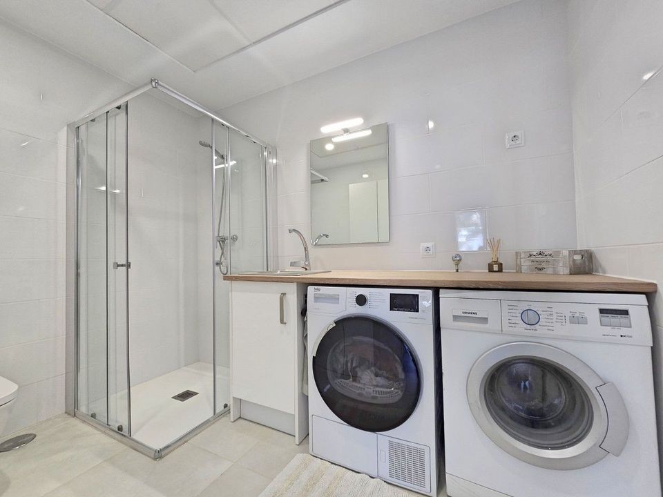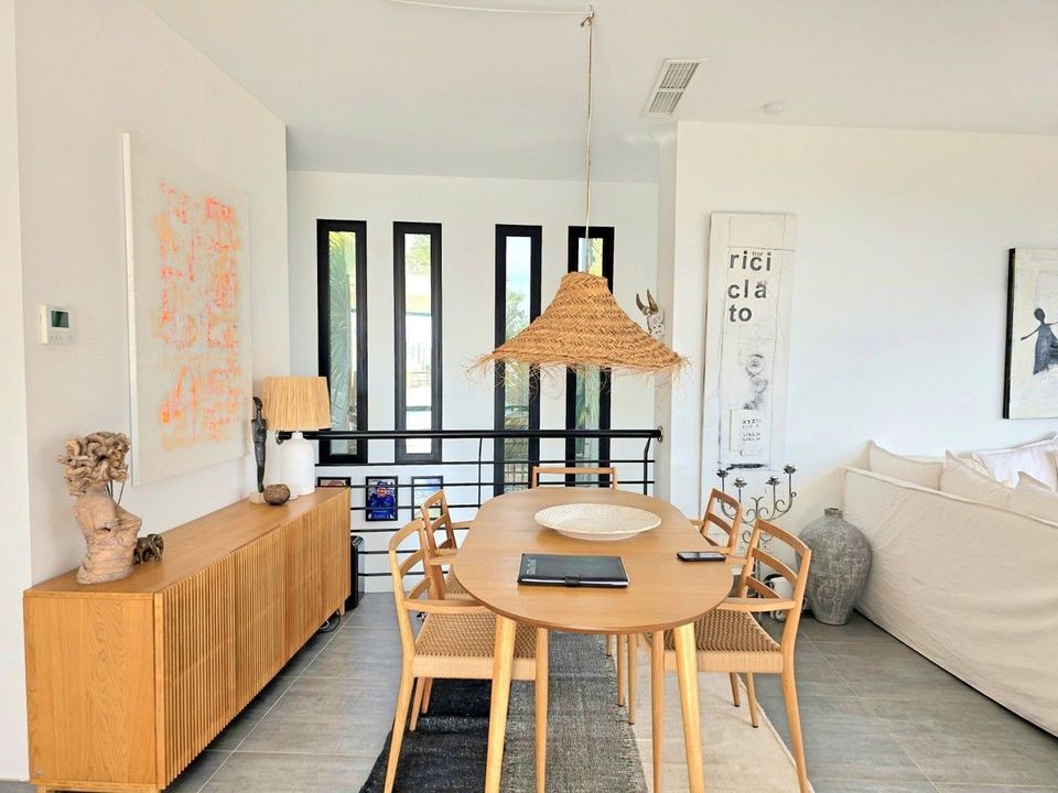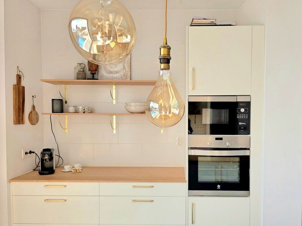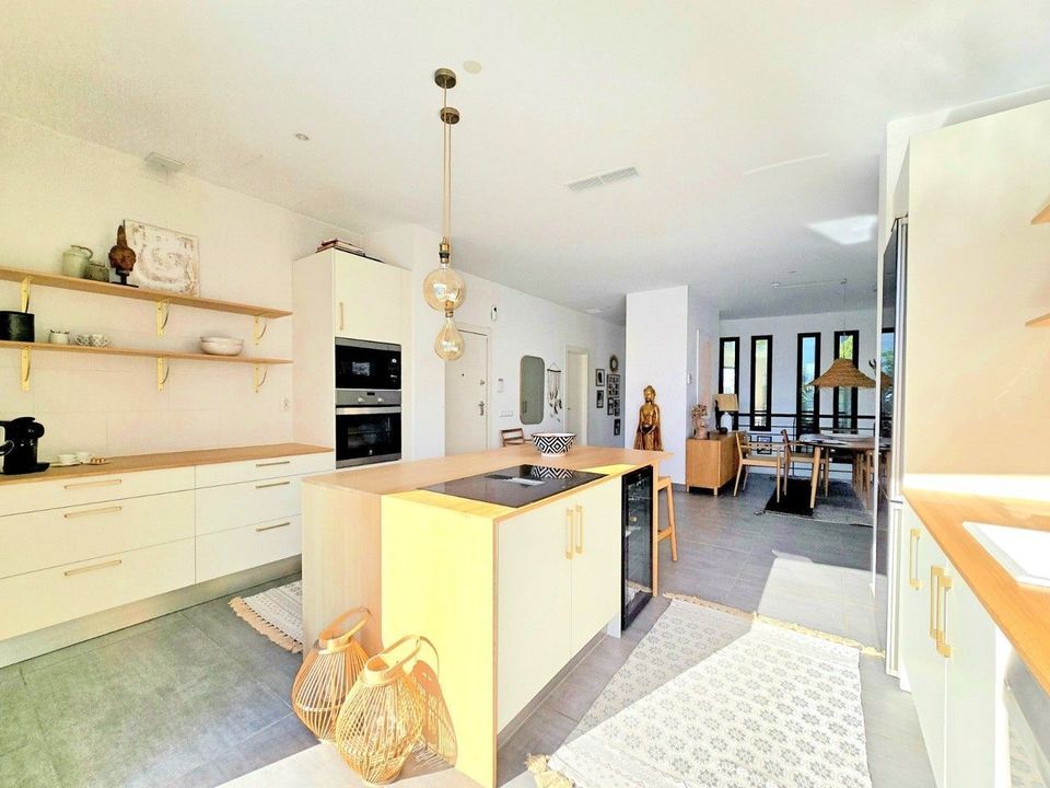 De bovenverdieping beschikt over een volledig gerenoveerde keuken in Scandinavische stijl die uitkomt op een ruime, lichtrijke woonkamer. Grote schuifpuien verbinden het interieur met het zonnige terras en creëren een moeiteloze binnen-buiten levensstijl.