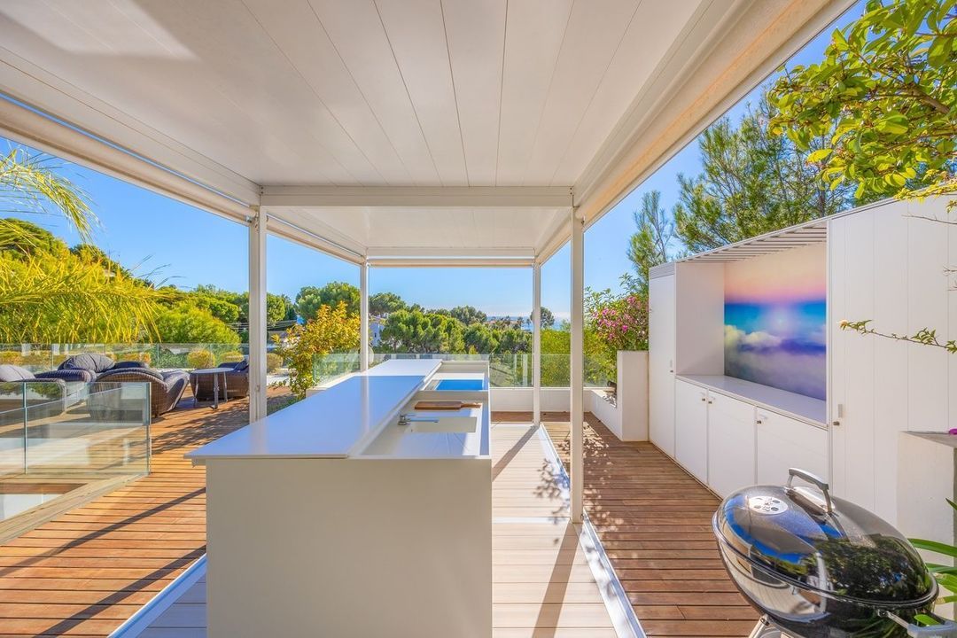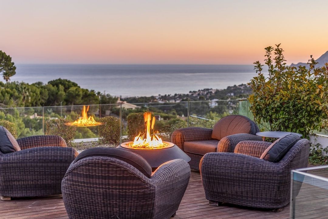 De villa beschikt over drie ruime slaapkamers met eigen badkamer, die elk direct uitkomen op het terras om het spectaculaire uitzicht op zee en de bergen vast te leggen. De open woonkamer, geïnspireerd op architectuur in Bali-stijl, toont verfijnde materialen, een gashaard en kamerhoge ramen die de glinsterende baai van Altea omlijsten.