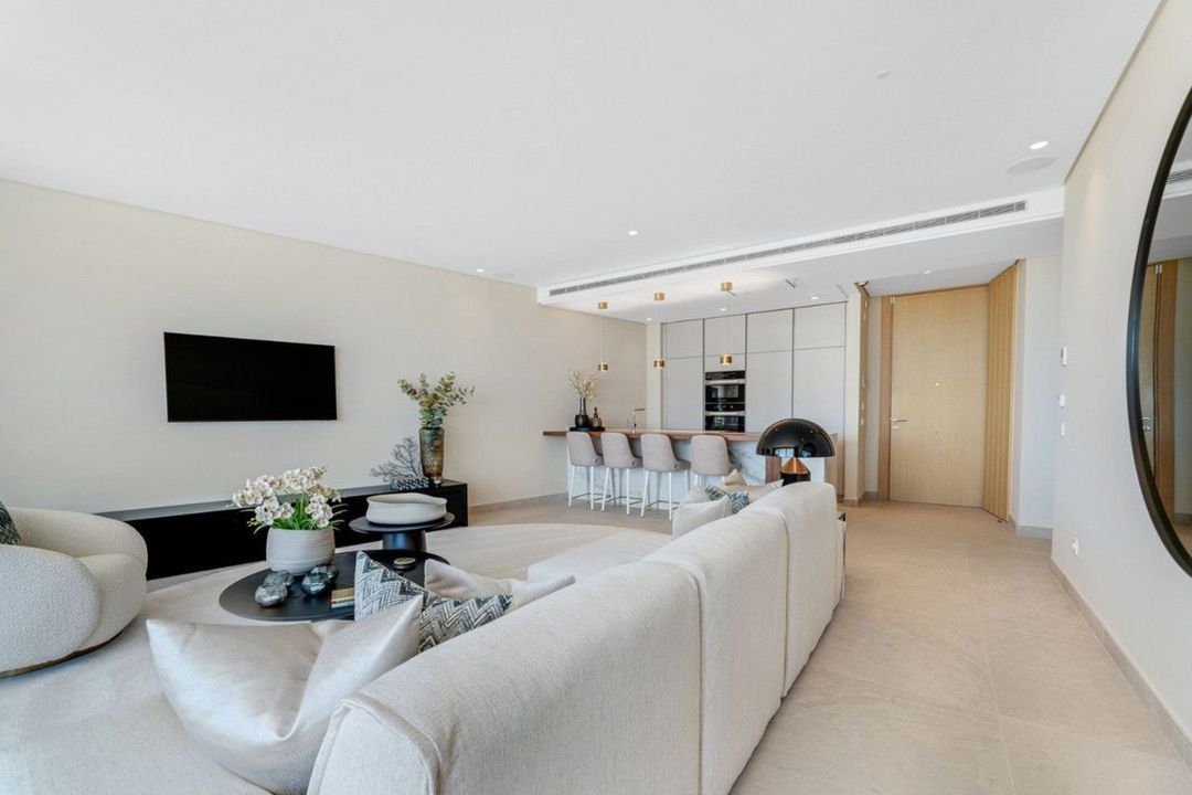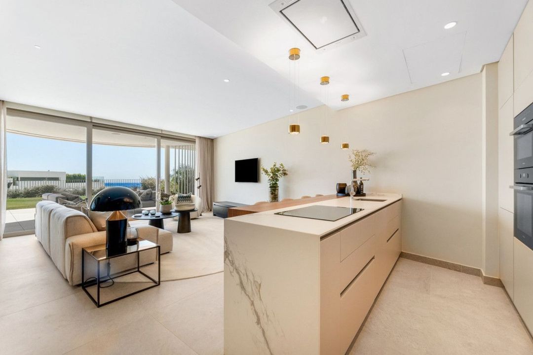 Het appartement straalt verfijnde elegantie uit, met ruime interieurs en een open woon- en eetkamer met kamerhoge ramen die het interieur vullen met natuurlijk licht. Schuifpuien geven toegang tot royale terrassen en een privé-tuin van 126 m² — de ideale plek om te genieten van panoramisch zeezicht en spectaculaire zonsondergangen boven de Middellandse Zee. De moderne keuken is uitgerust met hoogwaardige apparatuur, terwijl de twee slaapkamers met eigen badkamer comfort en privacy bieden. Een gastentoilet zorgt voor extra gemak. De woning beschikt tevens over twee privéparkeerplaatsen met pre-installatie voor het opladen van elektrische voertuigen en een berging.