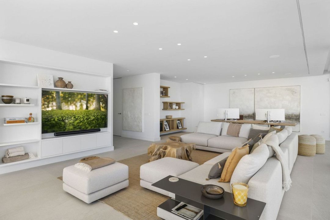 Stap naar buiten en ontdek het kroonjuweel van de villa: een prachtig verwarmd infinity zwembad dat overgaat in de horizon en een meeslepende zwemervaring biedt met de Middellandse Zee op de achtergrond. Het ruime terras, stijlvol ingericht met een bohemien chic tintje, biedt veelzijdige buitenruimtes, waaronder een eethoek, comfortabele loungesets, een tv-hoek en luxe ligstoelen om te genieten van de serene omgeving.