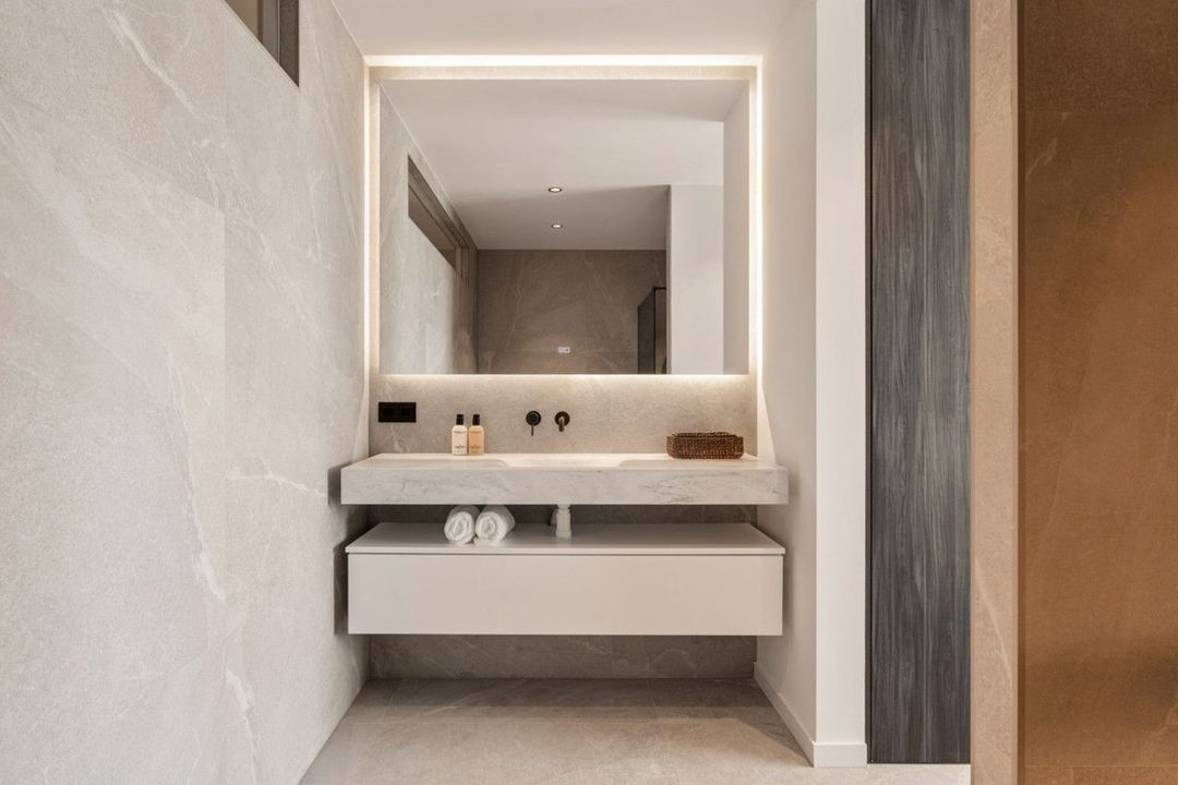 On the upper floor, the three bedrooms are laid out to provide privacy and convenience. Each has an en-suite bathroom and direct access to a terrace, creating private outdoor spaces with outstanding sea and mountain vistas. The master suite stands out with a larger terrace, spacious proportions, and a refined interior atmosphere. These features create a perfect balance of functionality and relaxation, allowing residents to enjoy views that capture the essence of the Costa del Sol.