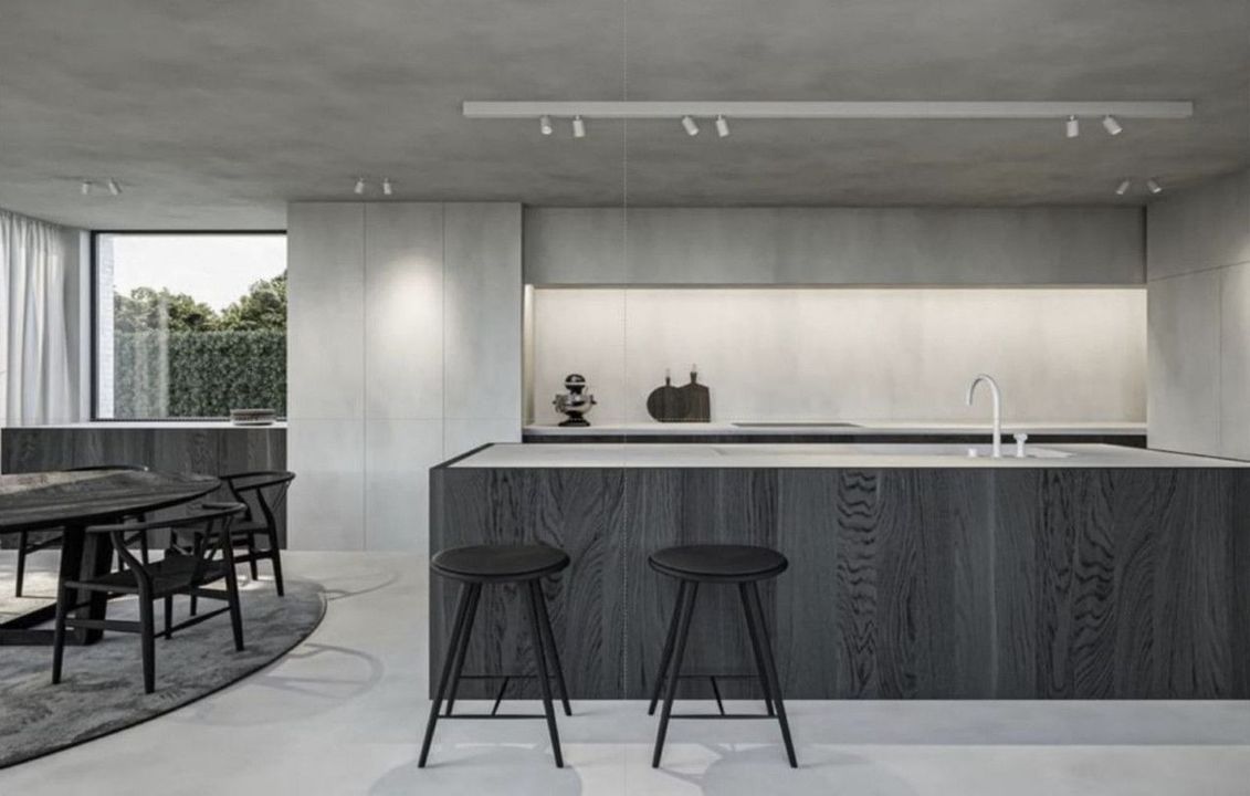 - Kitchen with steel frame doors covered with COVERLAM and kitchen island from COVERLAM