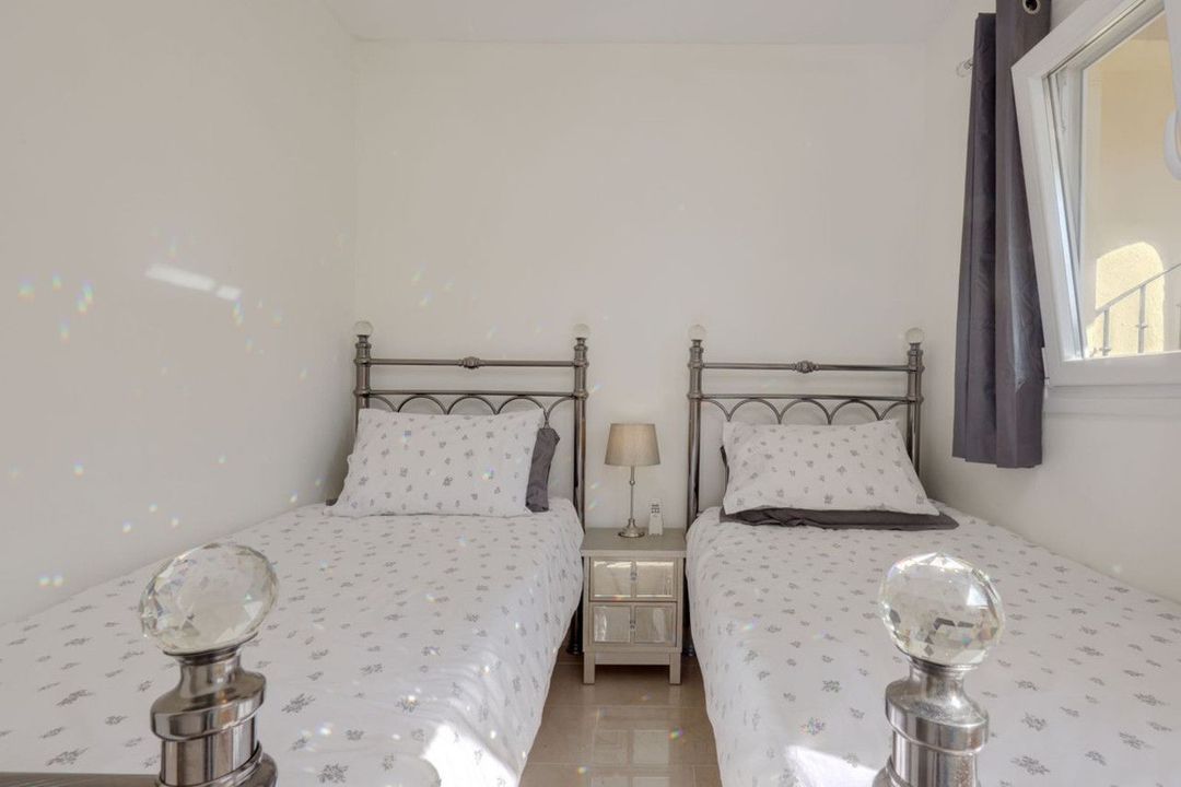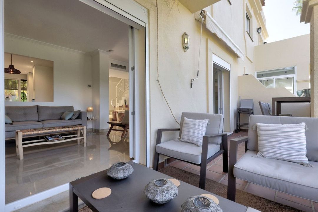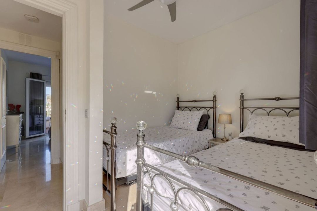 Upstairs there are 2 full bedrooms and a smaller 3rd bedroom and a full shared bathroom. The main bedroom has it´s own private terrace and sea and golf views.