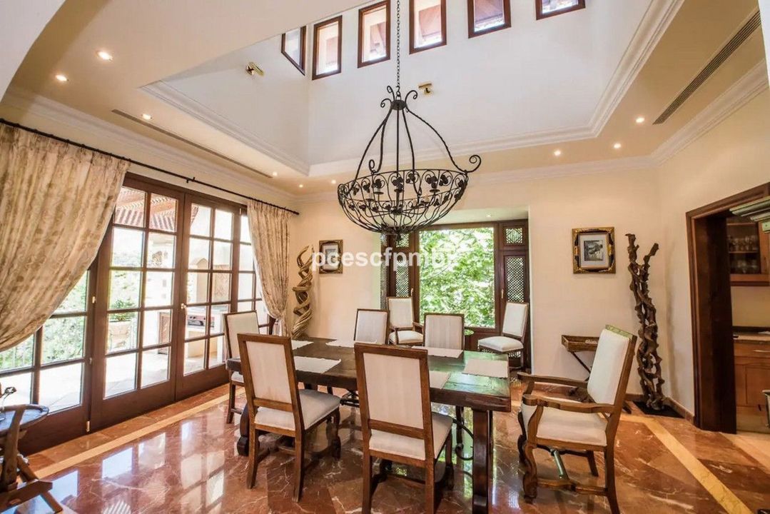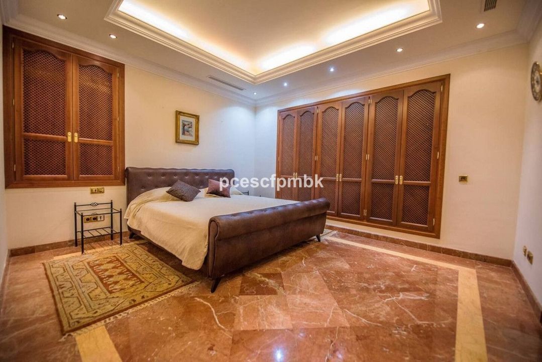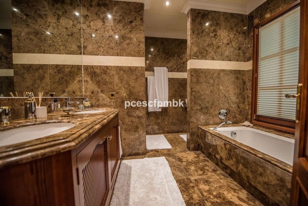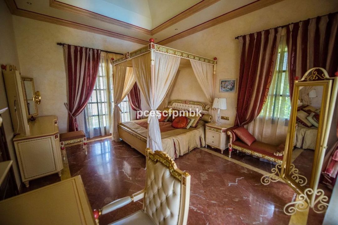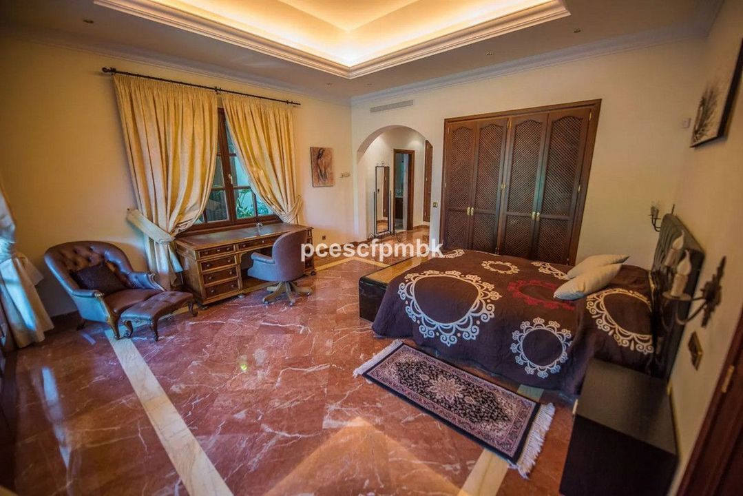 Terras met verre uitzichten, nog 4 slaapkamers met terrassen en marmeren badkamers en 2 kinderkamers met gedeelde badkamers. Royale woonruimtes met charmant en comfortabel meubilair completeren deze Spaanse flair. In totaal beschikt het huis ook over 6 terrassen (sommige met verre uitzichten), keuken, 2 garages voor 4 auto's, een ruim en volledig uitgerust fitnesscentrum en een prachtig zwembadgedeelte met 2 zwembaden met verschillende temperaturen en een whirlpool.