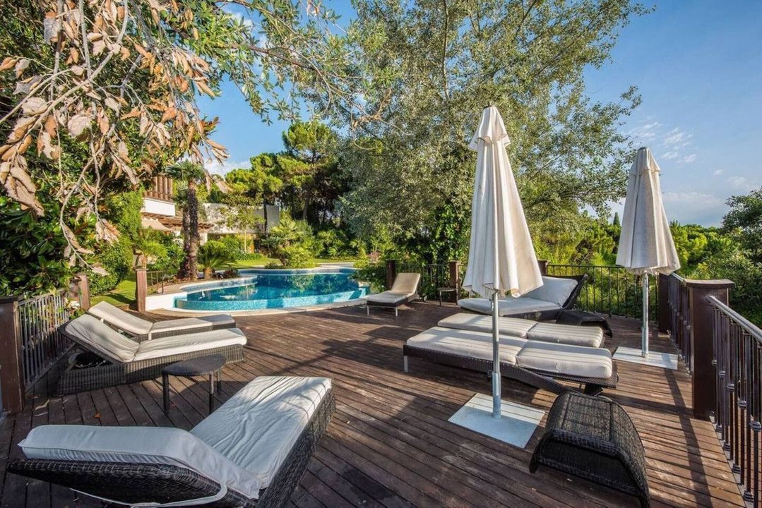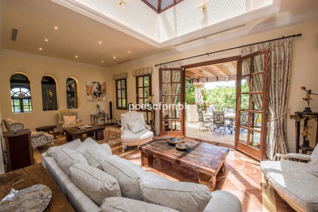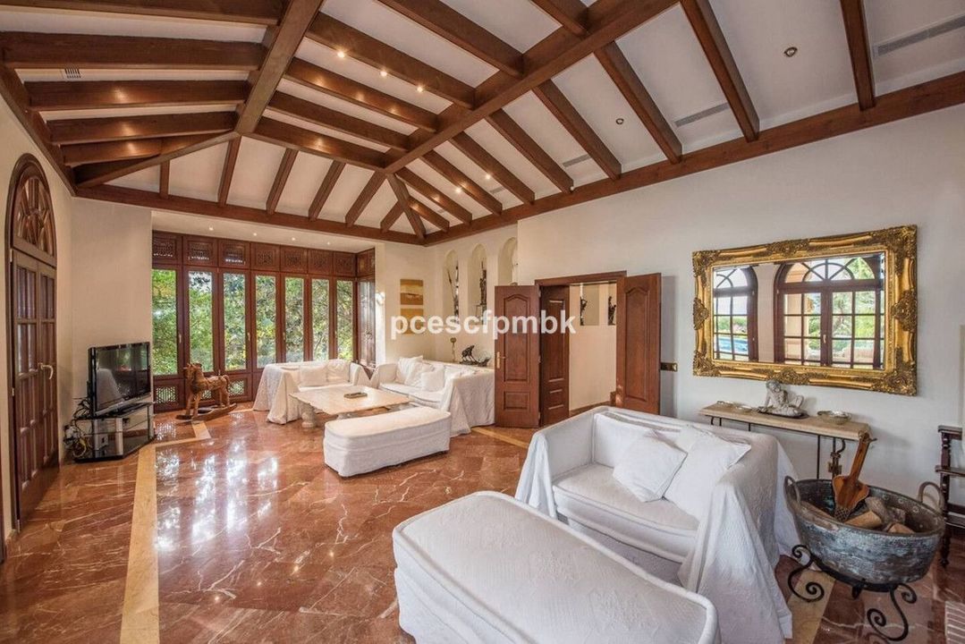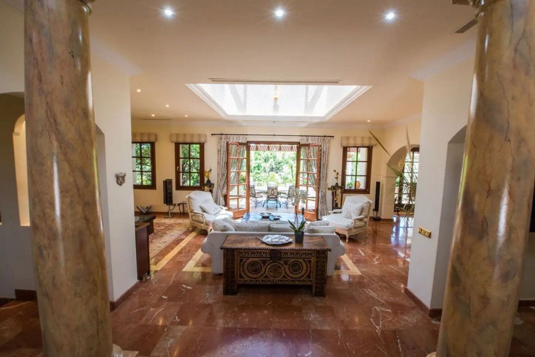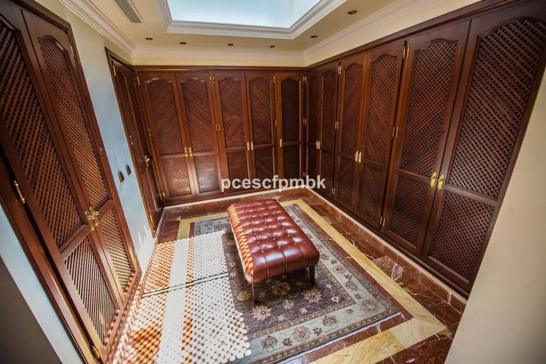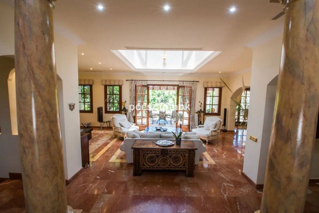 Terras met verre uitzichten, nog 4 slaapkamers met terrassen en marmeren badkamers en 2 kinderkamers met gedeelde badkamers. Royale woonruimtes met charmant en comfortabel meubilair completeren deze Spaanse flair. In totaal beschikt het huis ook over 6 terrassen (sommige met verre uitzichten), keuken, 2 garages voor 4 auto's, een ruim en volledig uitgerust fitnesscentrum en een prachtig zwembadgedeelte met 2 zwembaden met verschillende temperaturen en een whirlpool.