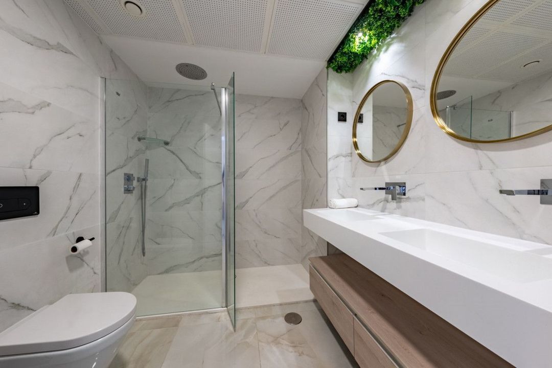 With over 100 m² of interior space, it features 3 spacious bedrooms, 2 fully upgraded bathrooms with premium finishes, and a very private 45 m² sun-drenched terrace boasting panoramic views of surrounding mountains. Every detail has been carefully selected, including a designer kitchen equipped with Bosch appliances, a BORA hob with integrated extractor, and a high-end countertop. The living room is elegantly finished with Cavalli wallpaper, enhancing the luxurious feel of the space.