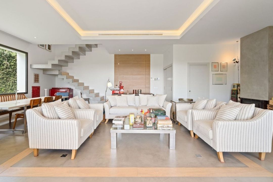 The outdoor areas reflect the Mediterranean lifestyle at its purest. A long swimming pool forms the heart of the garden, surrounded by lush greenery and mature trees. Terraces shaded by sleek wooden pergolas invite dining outdoors, while a secluded gazebo offers an intimate space to take in the scenery.