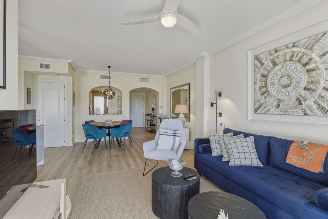 Dit elegante appartement op de eerste verdieping in Los Arqueros, Costa del Sol, biedt de perfecte combinatie van modern comfort en wonen in resortstijl. Gelegen op een gewilde eerstelijns golf-locatie en met een bevoorrechte zuidwestelijke oriëntering, profiteert het pand de hele dag van zon, evenals van zeezicht, uitzicht op de omliggende bergen, perfect onderhouden fairways, aangelegde tuinen en de gemeenschappelijke zwembaden. Het maakt deel uit van een beveiligd, omheind complex met 24-uursbewaking, op slechts een korte rijafstand van lokale winkels, het dorp Benahavís en de levendige voorzieningen van Marbella en Puerto Banús.