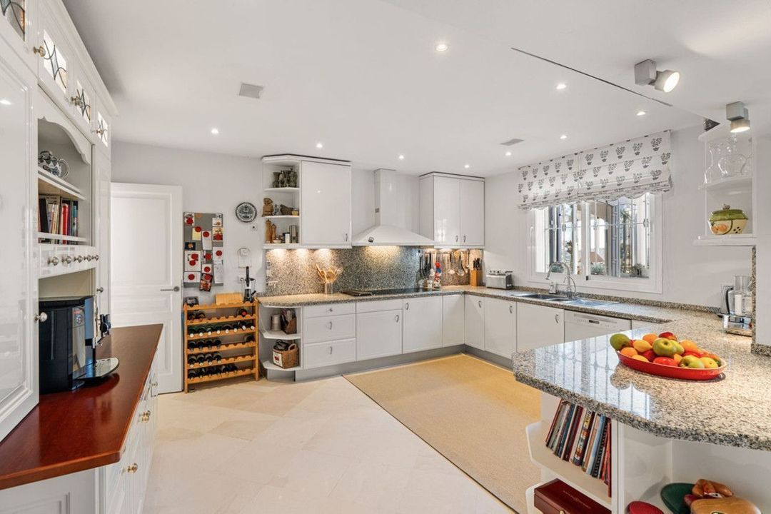 De volledig ingerichte keuken ligt om de hoek, apart van de woonkamer, en heeft directe toegang tot een van de terrassen, waardoor het de ideale plek is om buiten van een uitgebreid ontbijt te genieten. De keuken beschikt ook over een extra berging met eigen airconditioning, perfect om boodschappen in goede staat te bewaren.