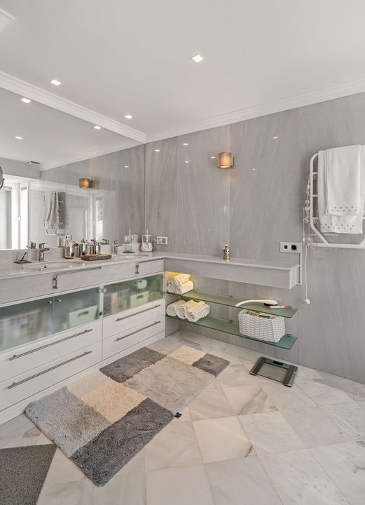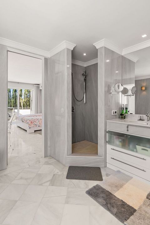 Op elke verdieping vindt u een apart gastentoilet, wat extra gemak biedt. De master suite (52 m²) bevindt zich aan de voorkant van het huis (zuidkant) en heeft hetzelfde fantastische uitzicht. Vanuit deze suite heeft u directe toegang tot een van de terrassen waar een jacuzzi en buitendouche op u wachten en waar u kunt genieten van volledige privacy. Vlak bij de gang vindt u een aparte was-/bergruimte, die voldoende ruimte biedt om huishoudelijke artikelen netjes op te bergen.