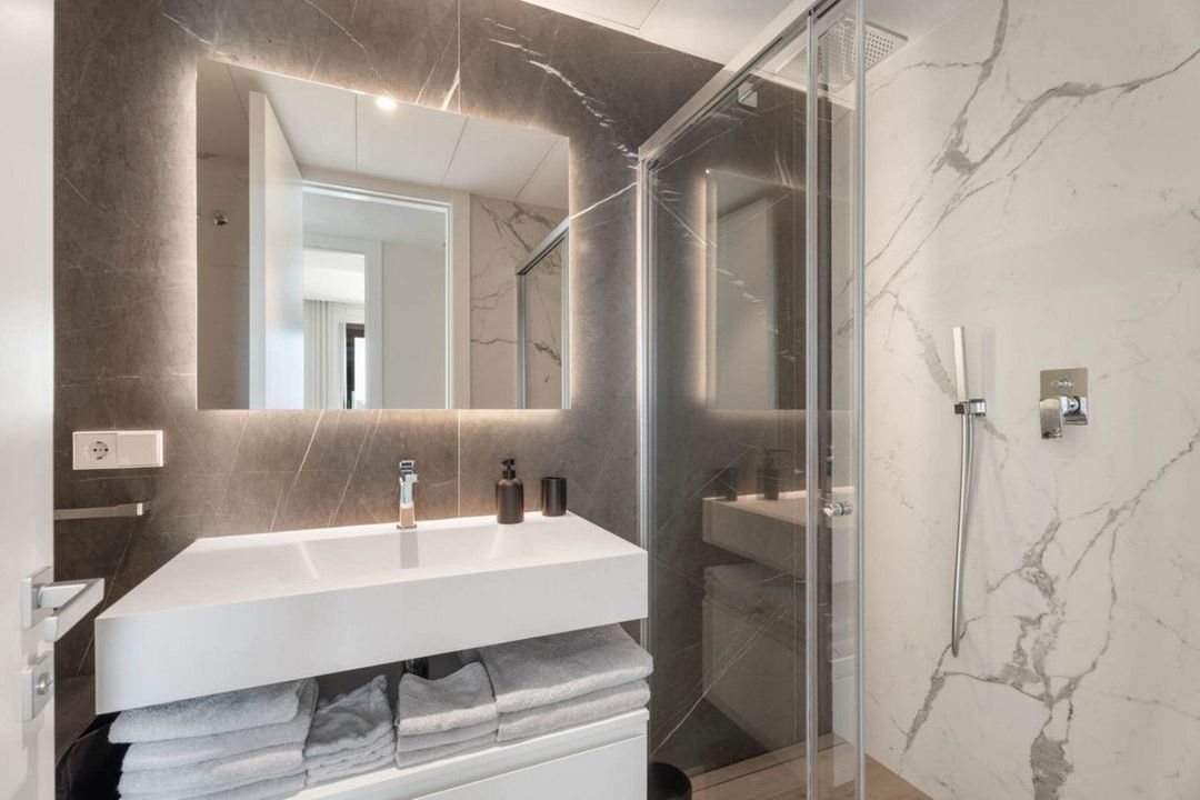 De keuken is volledig uitgerust met hoogwaardige Siemens-apparatuur en moderne afwerkingen. Beide slaapkamers zijn ontworpen met oog voor privacy en comfort, met ingebouwde kasten en grote ramen. De hoofdslaapkamer heeft een en-suite badkamer en directe toegang tot het terras; de tweede slaapkamer heeft veel natuurlijk licht en een aangrenzende badkamer.