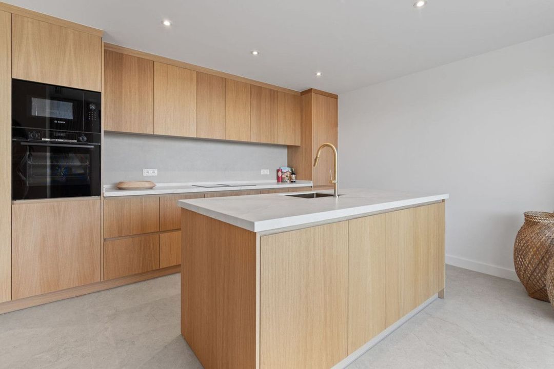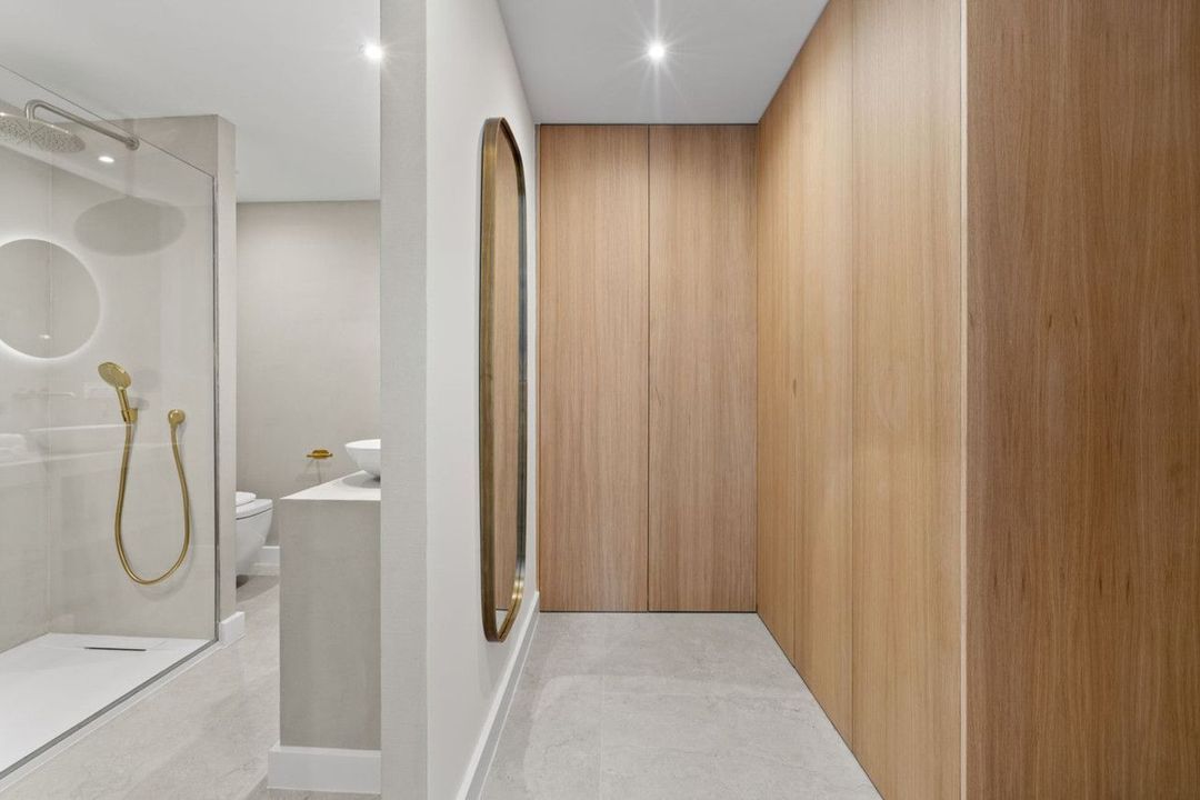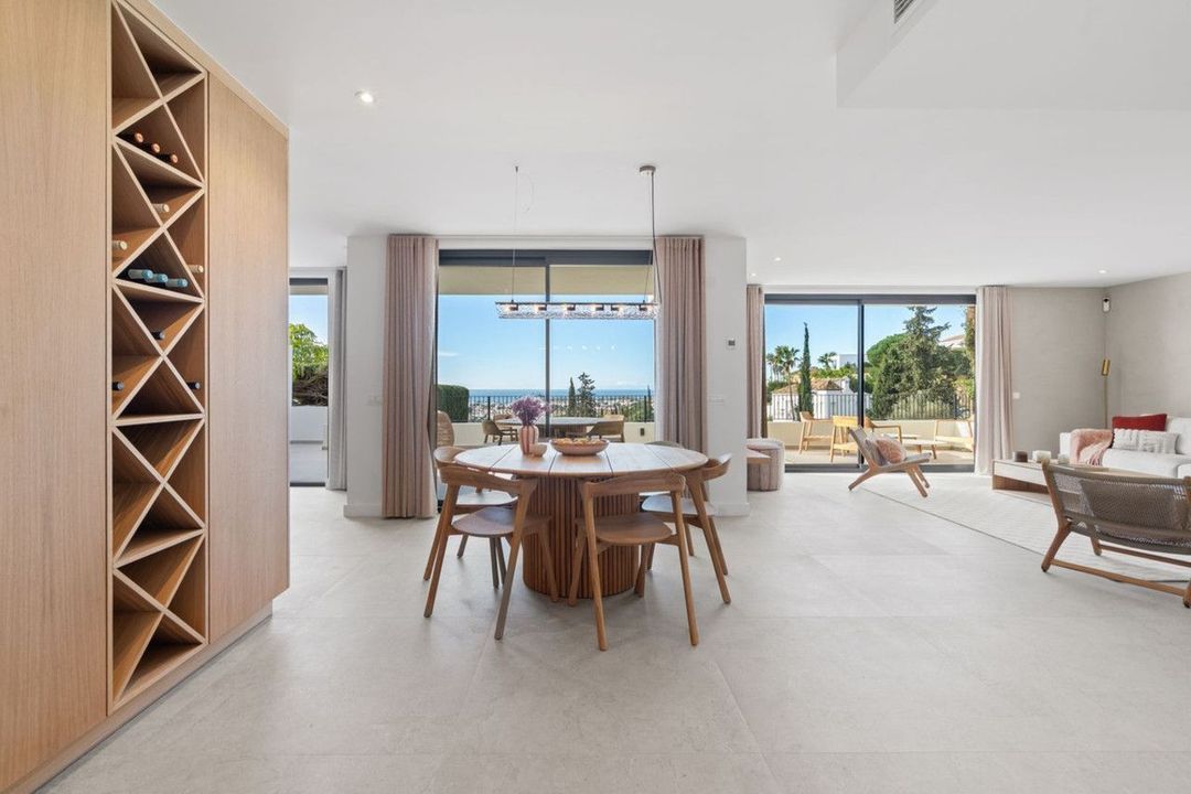 De open woon- en eetruimte sluit naadloos aan op een op maat gemaakte eikenhouten keuken, uitgerust met hoogwaardige Bosch-apparatuur. Grote schuifpuien zorgen voor een vloeiende overgang naar de buitenterrassen en het privézwembad, waardoor binnen- en buitenleven perfect samenkomen.