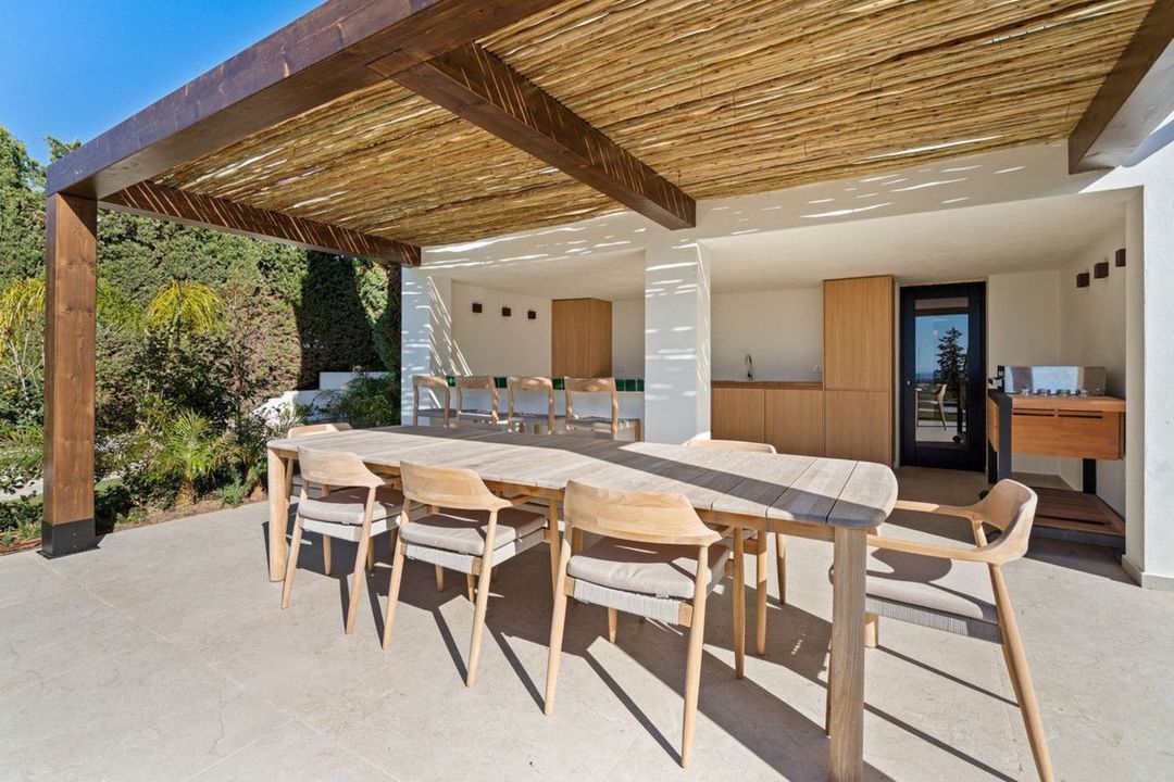 Een volledig uitgeruste overdekte buitenkeuken met bar vormt het hart van het terras. Deze is voorzien van ingebouwde koelkasten, een spoelbak, werkblad en zitplaatsen, ideaal om gasten te ontvangen. Aansluitend bevindt zich een indrukwekkende houten eettafel voor 10 personen onder een ruime pergola, allemaal met uitzicht op zee.