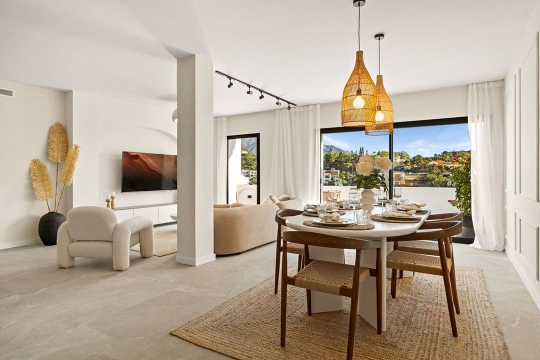 Met oog voor detail gerenoveerd, beschikt de woning over een lichte open indeling met aparte zones om te ontspannen, dineren en socialiseren. De volledig uitgeruste keuken heeft warme eiken details en een centraal eiland, en sluit naadloos aan op een groot terras. Vanaf hier geniet u van adembenemende uitzichten op de golfbaan en het meer, de La Concha-berg en de Middellandse Zee.