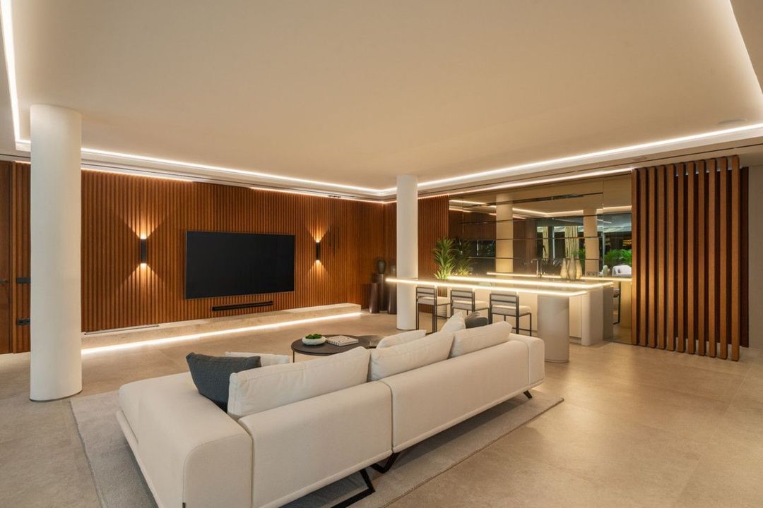 Inside, the villa features exclusive furniture by Aalto Exclusive Design, delivering a cohesive aesthetic defined by natural tones, high-end materials and bespoke detailing. The main living area is expansive, bright and designed for flow, with large sliding panels that open the entire space onto the terrace. Integrated lighting, refined textures and carefully curated furnishings create an environment that is both functional and visually impactful.