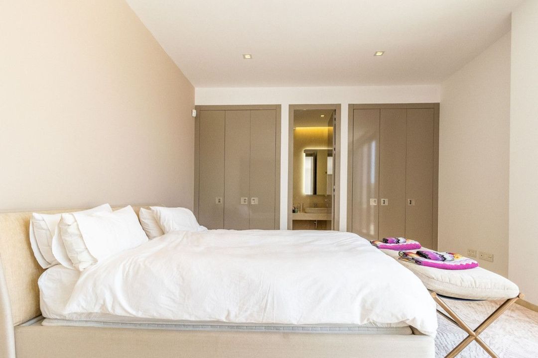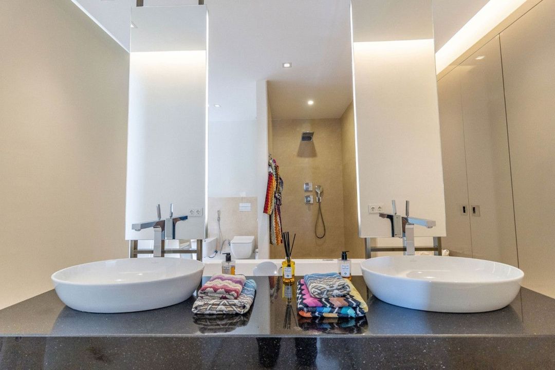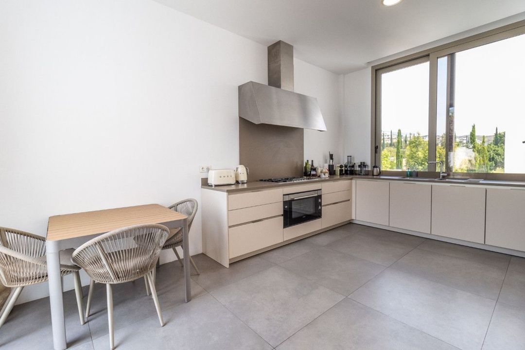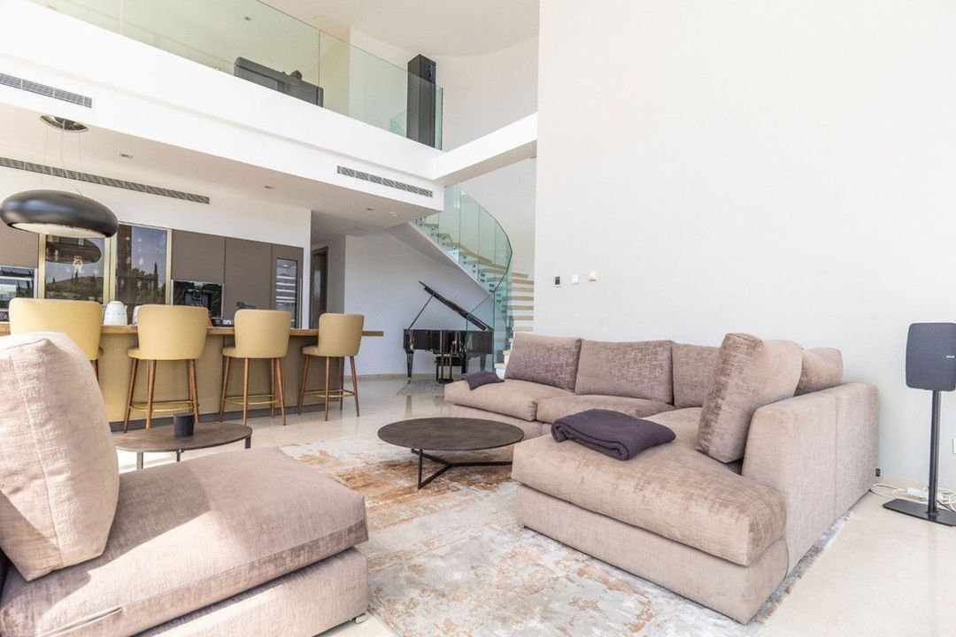 Upon entering the property on the first floor, you are captivated by the breathtaking panoramic views and the expansive glass facades of the villa. This level boasts a fully fitted kitchen with top quality appliances, a spacious living and dining area enjoying the views, and several bedrooms. The property also includes a private lift for easy access to all floors. On the lower floor, garden level, there is another open plan kitchen with large breakfast bar, leading into the living area that continues onto the terraces and gardens, plus additional bedrooms. The top floor boasts the master bedroom suite plus another guest bedroom, a solarium terrace, perfect for enjoying the stunning views.