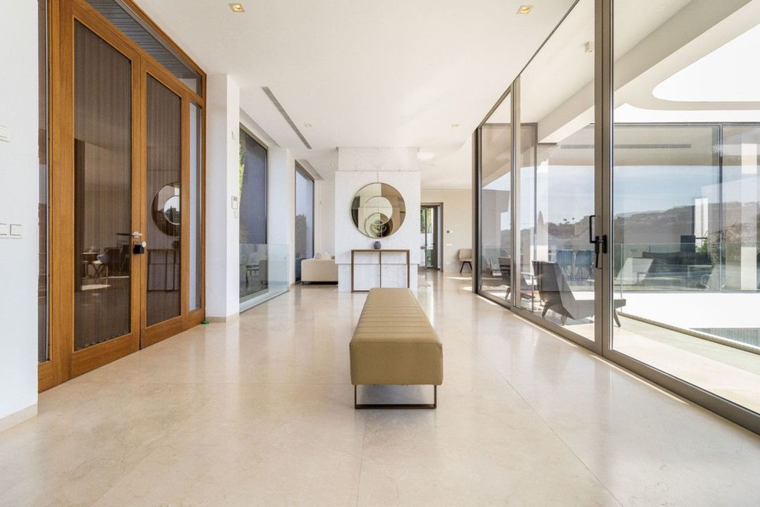 A breathtaking 6 bedroom frontline golf villa in Los Flamingos Golf, Benahavis with panoramic views down to the sea. A light and bright modern home set on a very good sized plot of 2.577m², this villa offers ample space and privacy. The property features 6 bedrooms, all with en-suite bathrooms, as well as an additional guest toilet.
