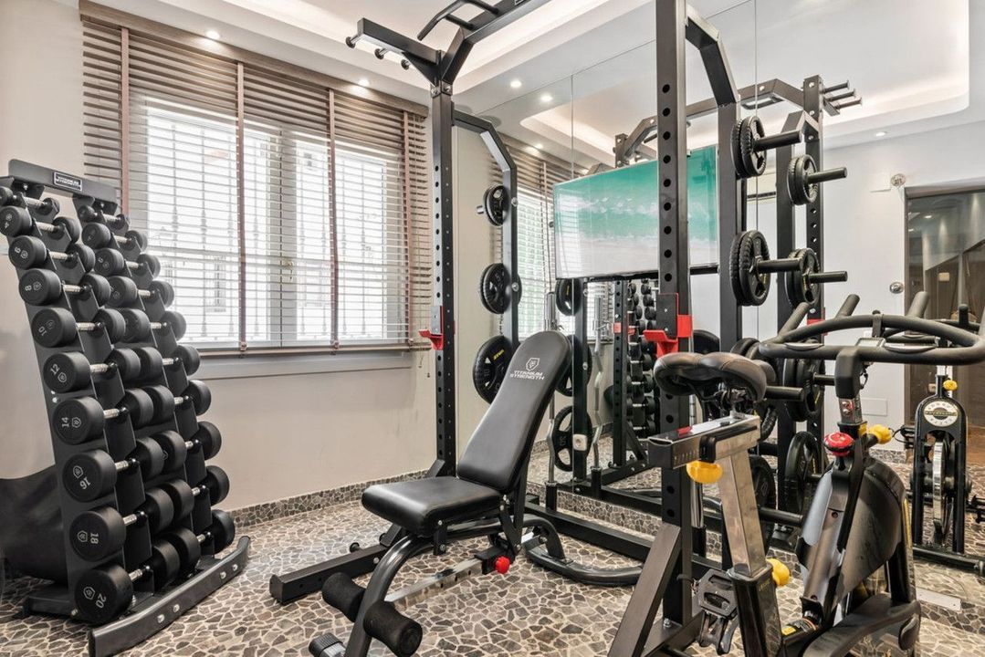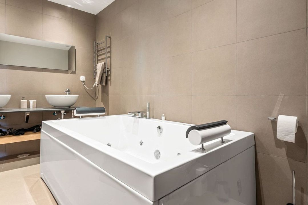The property features underfloor heating and full air conditioning, making it suitable for both holiday living and permanent residence. Each bedroom has its own en-suite bathroom, and there is also a gym with a sauna for added comfort.