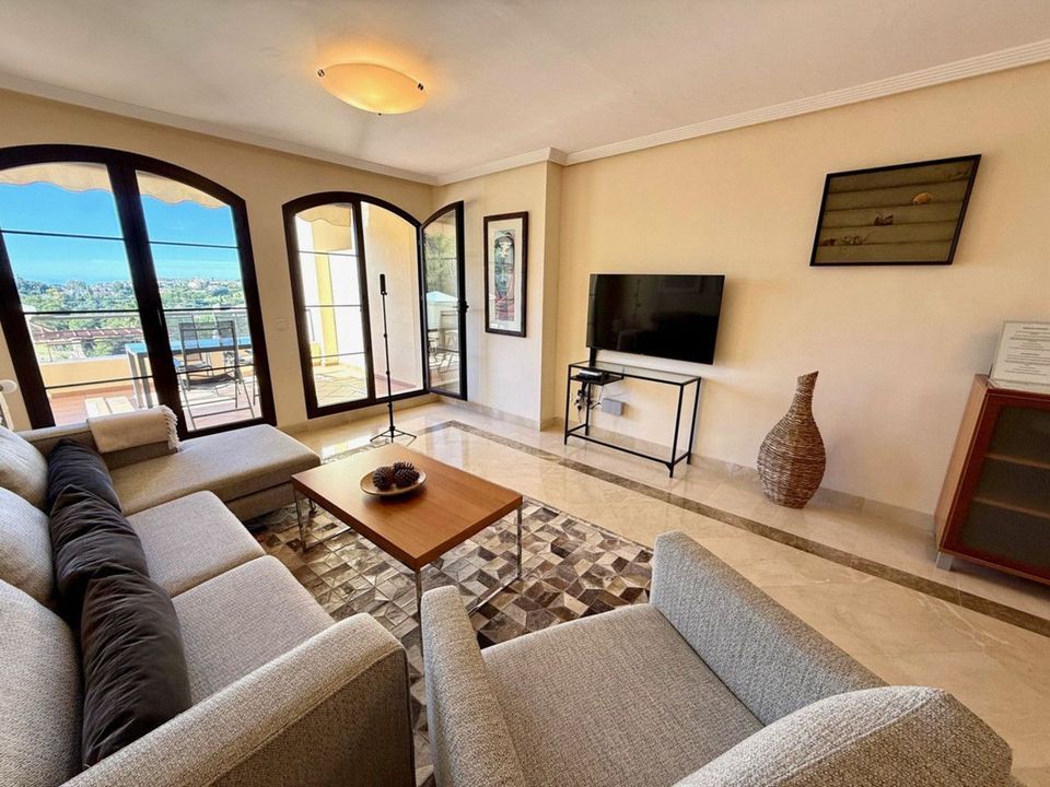 This southfacing 2 bedroom apartment is situated in the prestigous Los Arqueros Golf and Country Club complex. The apartment consists of 2 bedroom, 2 bathrooms, dining- living area, kitchen and a good size south facing terrace with views to the golf and sea. There is an underground parking included as well as a storage room. The comunity has nice gardens and a 2 swimming pools. Los Arqueros is a perfect location in the country side, at the golf and at only a few minutes to San Pedro and the beach.