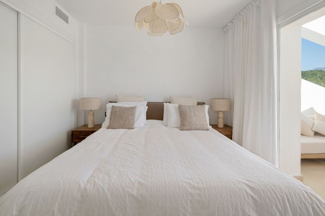 Op de middelste verdieping biedt het appartement twee ruime slaapkamers en twee stijlvolle badkamers. Vanaf deze verhoogde positie genieten de bewoners van uitgestrekte uitzichten over de Middellandse Zee, de omliggende golfbanen en de bergen, wat een gevoel van ruimte, licht en rust creëert.