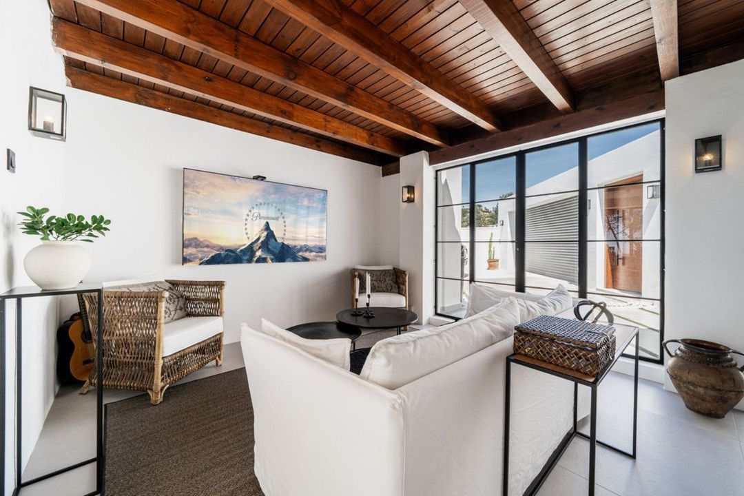 Atop the charming Andalusian village of Benahavís, 400 metres above sea level and surrounded by the Sierra de las Nieves and lush greenery, lies this haven. In an exclusive gated community, this splendid villa, inspired by traditional Spanish cortijos, stands nestled amidst a forest of pine and cork trees. With walls clad in brilliant white lime and red-tiled roofs, this retreat offers incredible sea views and the feeling of being immersed in nature, all just 20 minutes away from Marbella.