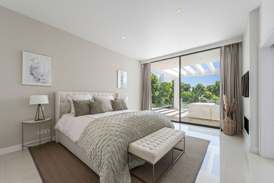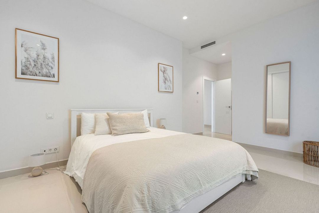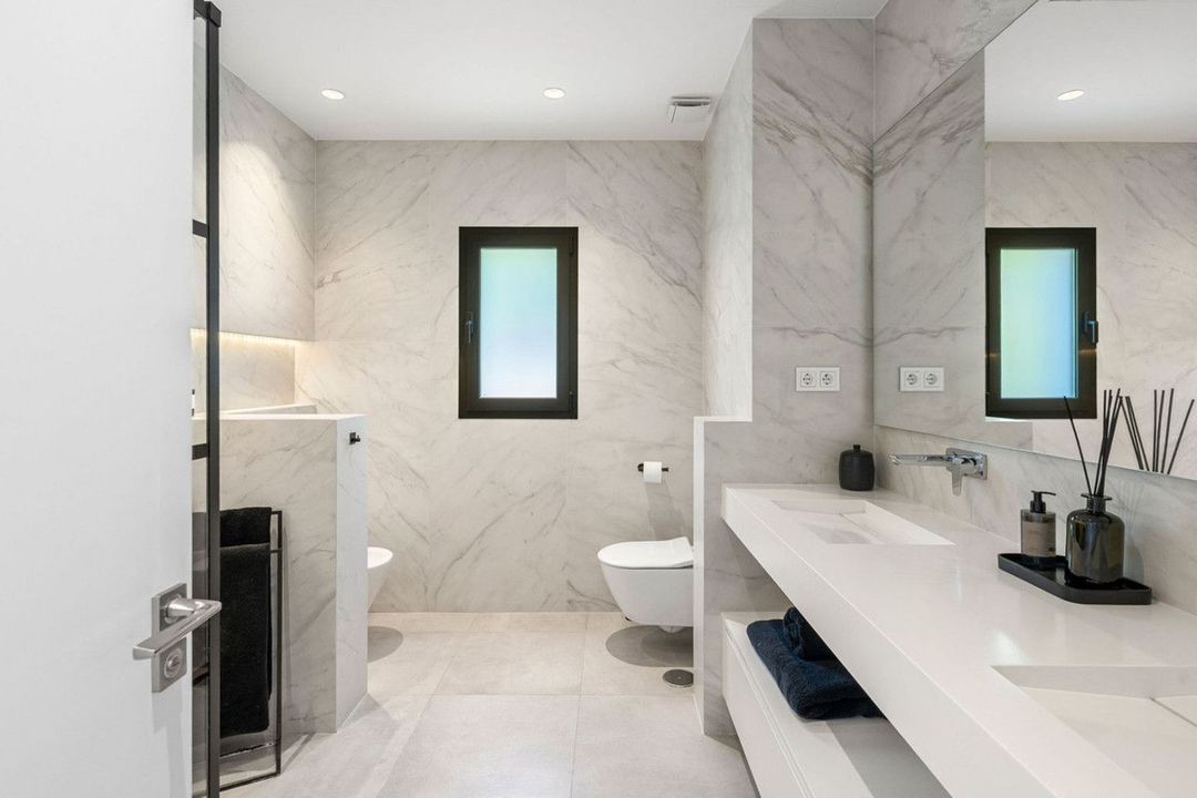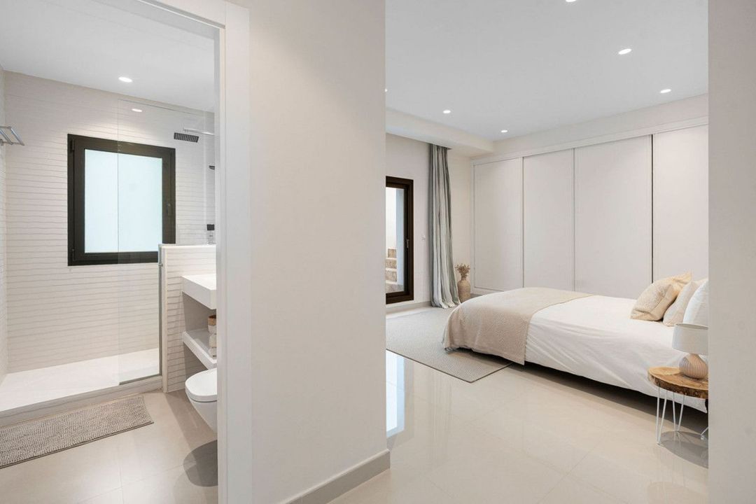 Op de bovenverdieping bevinden zich drie slaapkamers, allemaal met eigen badkamer. De master suite beschikt over een aparte zithoek, een grote inloopkast en een eigen badkamer, samen met directe toegang tot het hoofdterras.