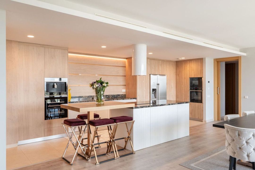 The apartment includes bespoke interior and exterior finishes, an innovative use of space with seamless indoor-outdoor integration, and an abundance of natural light. The large open-plan kitchen comes with a cooking island, breakfast bar, and a dedicated dining area, complemented by an integrated living room. It is equipped with modern amenities such as air conditioning for cooling and heating, fitted wardrobes, and a fully fitted kitchen with all appliances. The apartment also includes 3 underground parking spaces and 2 storage rooms, and features high-quality materials like ceramic, wood, and marble floors.