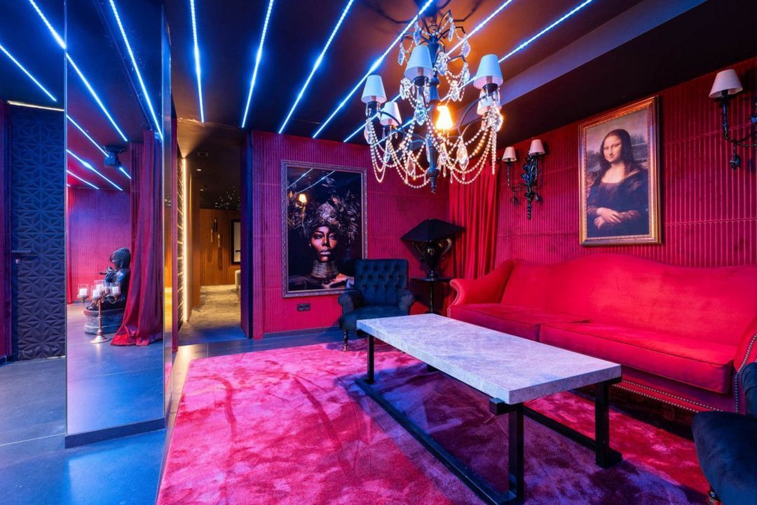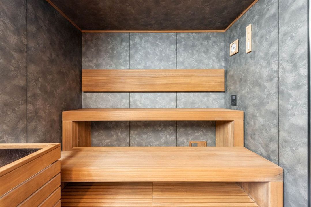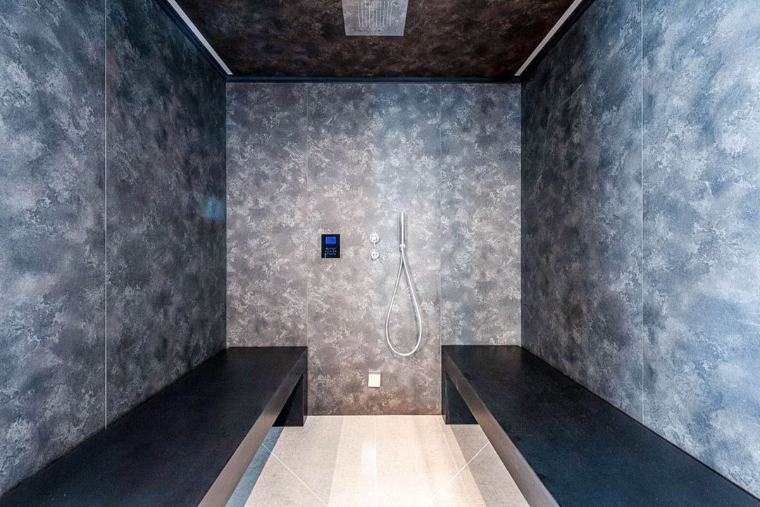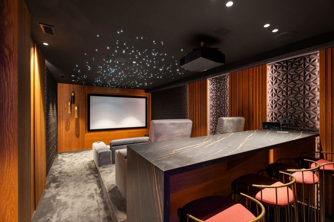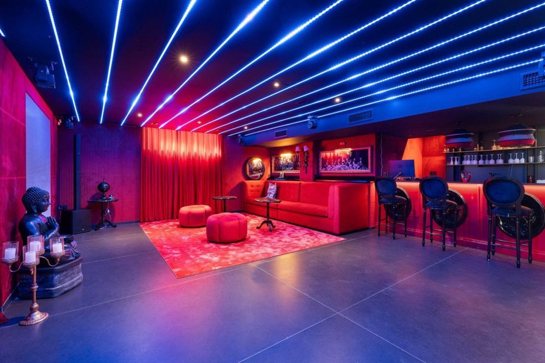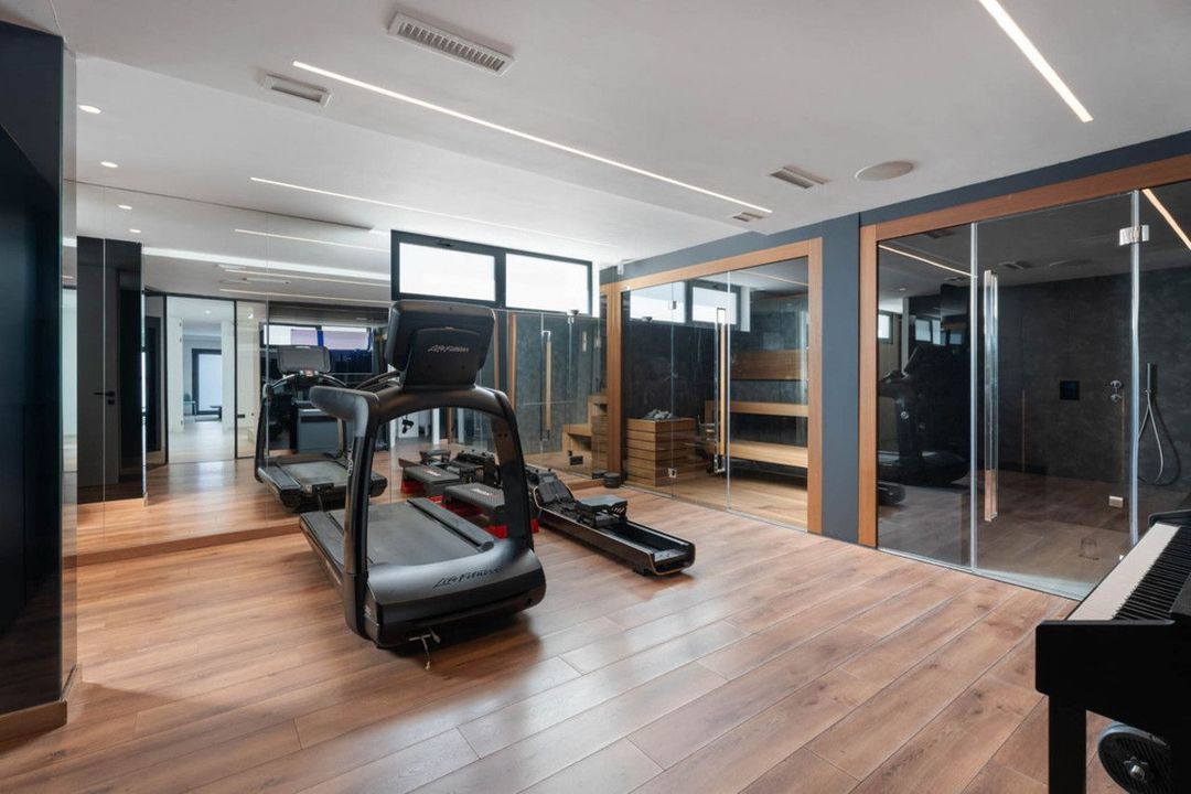 Het lagere niveau omvat de wellness- en ontspanningsruimtes, waaronder een bioscoop, fitnessruimte, sauna en een aparte ruimte voor bijeenkomsten. De woning beschikt tevens over een ruime garage met draaiplatforms voor eenvoudige manoeuvres.