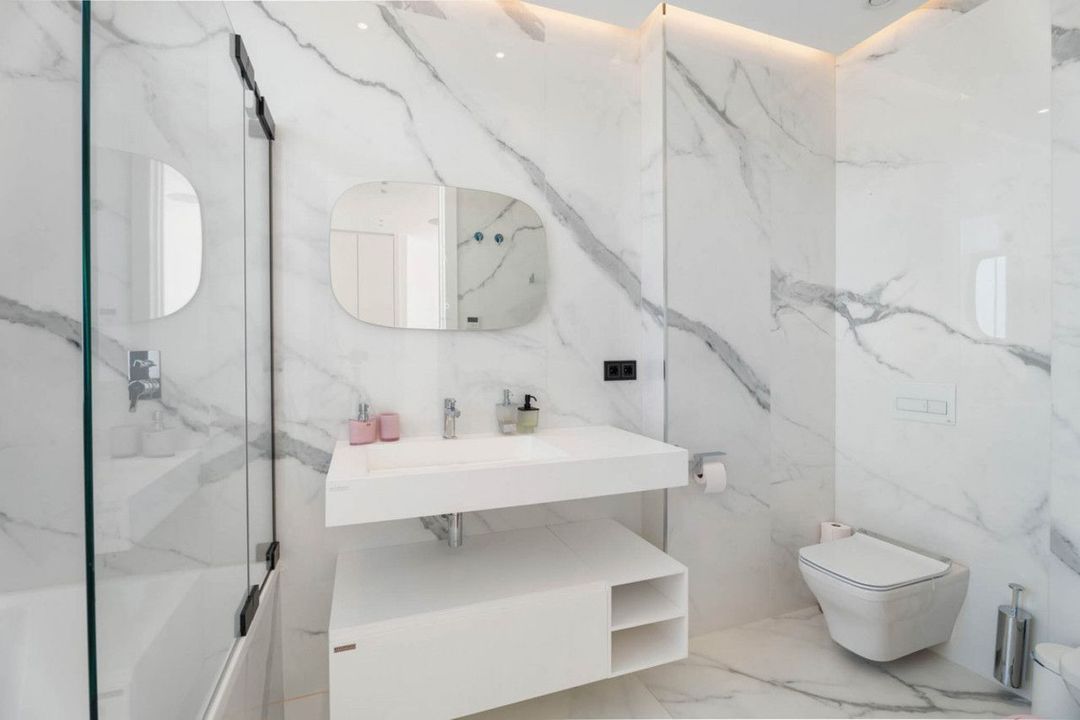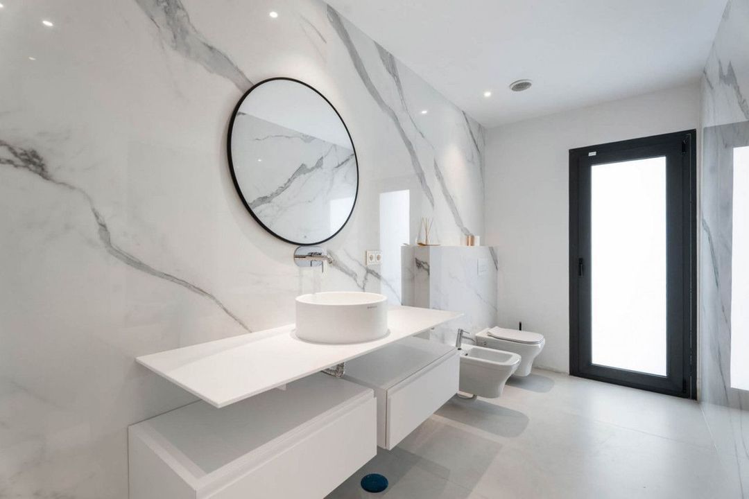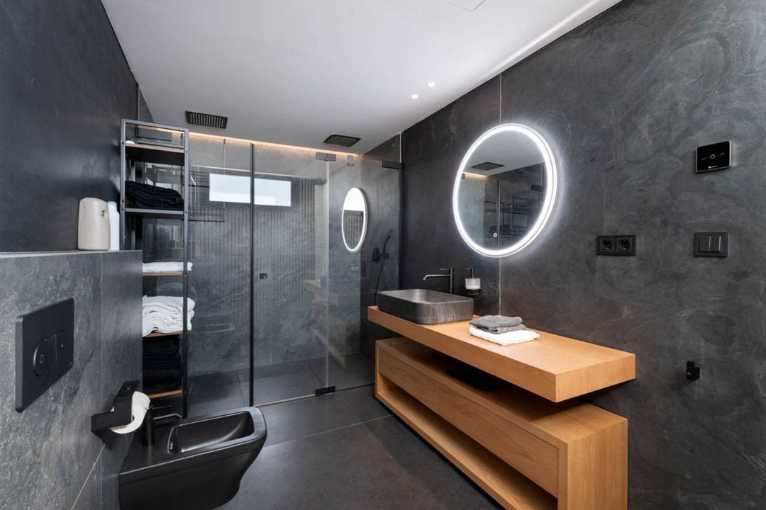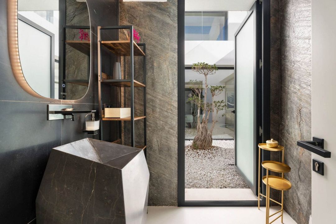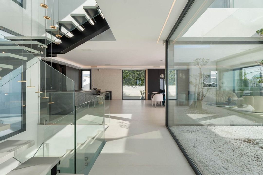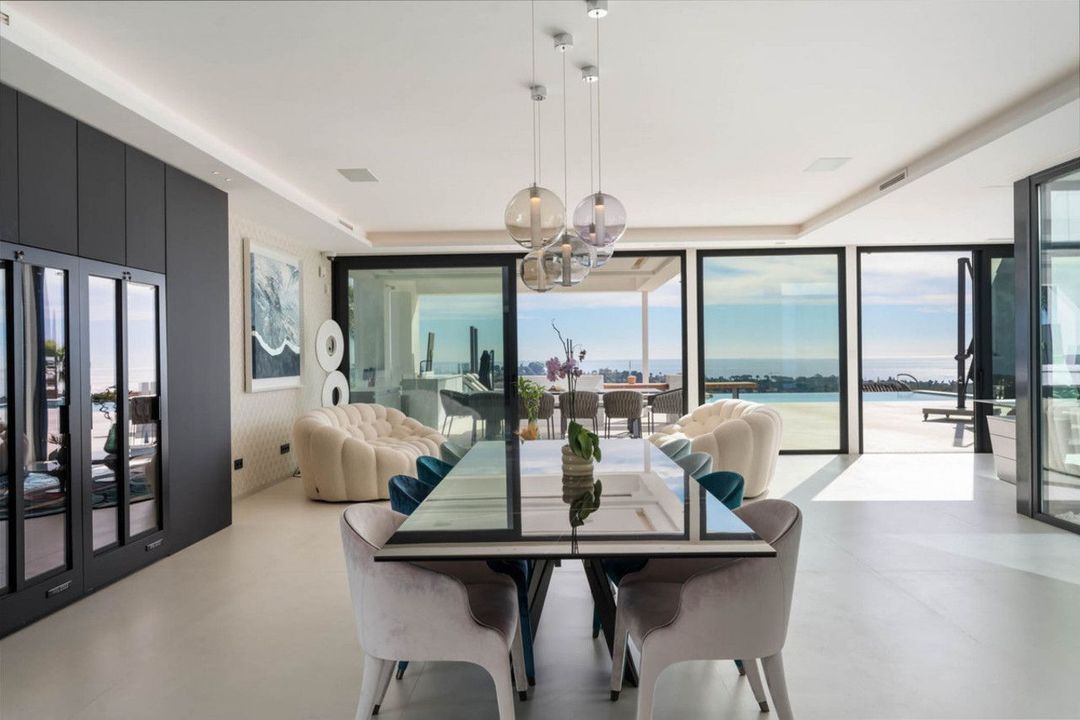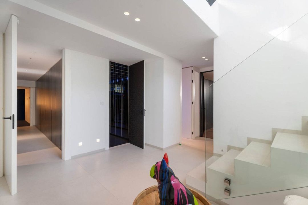 De woning is verdeeld over meerdere niveaus die met een lift zijn verbonden, met royale ruimtes en veel natuurlijk licht. Op de begane grond openen de leefruimtes zich naar het terras en de tuin via grote ramen die binnen en buiten met elkaar verbinden. Het infinity-zwembad reikt naar de horizon en versterkt de eenheid met het landschap.