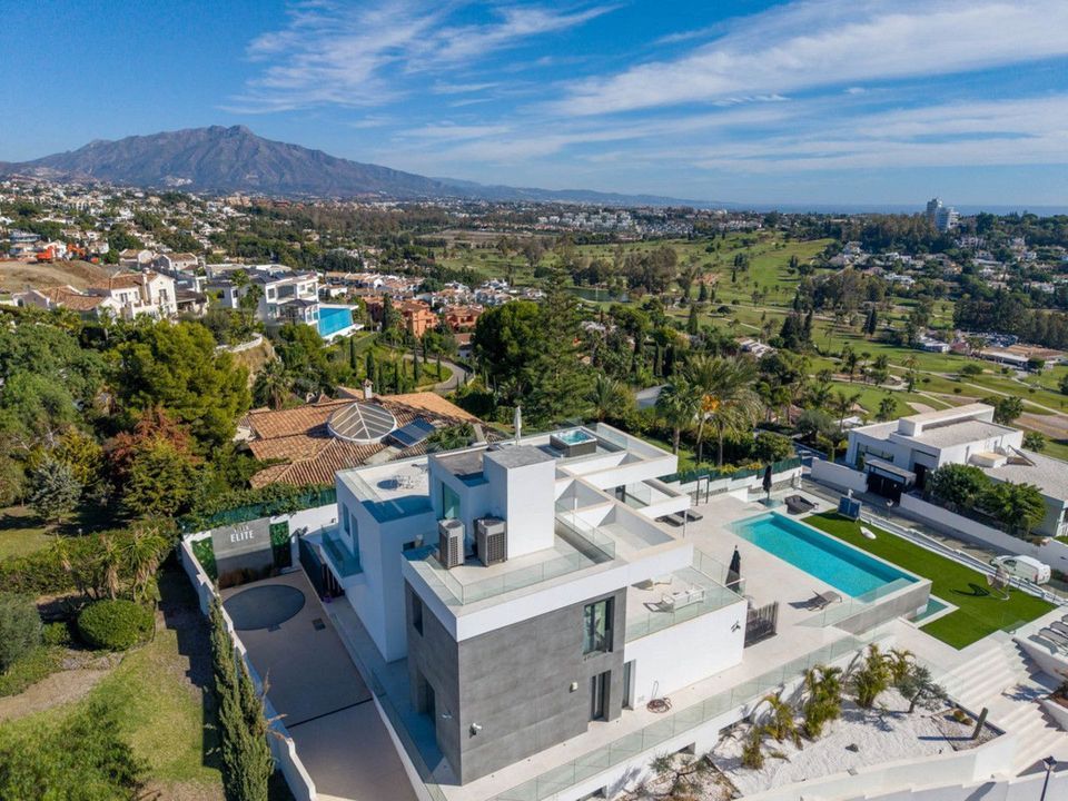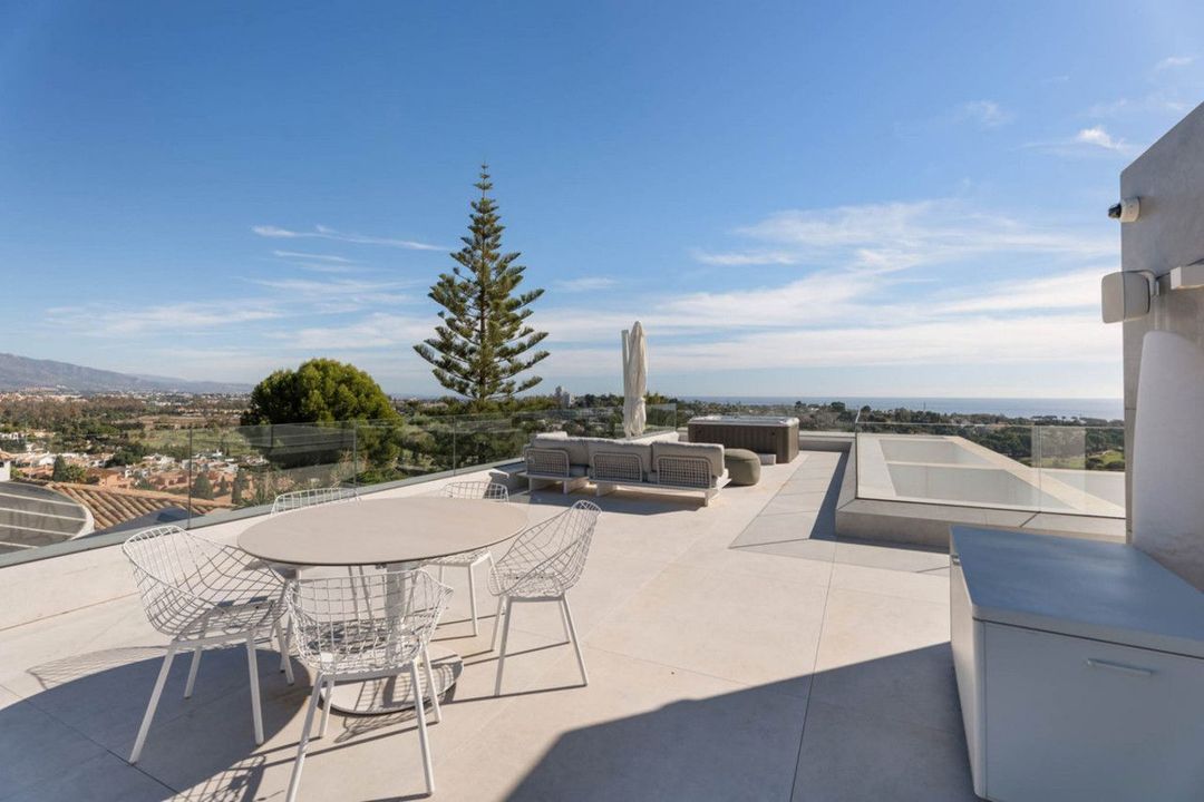 Deze designvilla in Paraiso Alto wordt gepresenteerd als een eigentijdse woning voor wie op zoek is naar privacy, ruimte en een directe verbinding met de omgeving. De verhoogde ligging biedt uitzicht op de golfbaan van El Paraíso, de Middellandse Zee, Gibraltar, de Afrikaanse kust en de berg La Concha vanuit diverse kamers en buitenruimtes, wat een bijzonder panorama creëert.