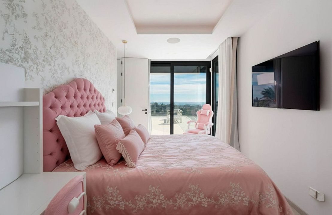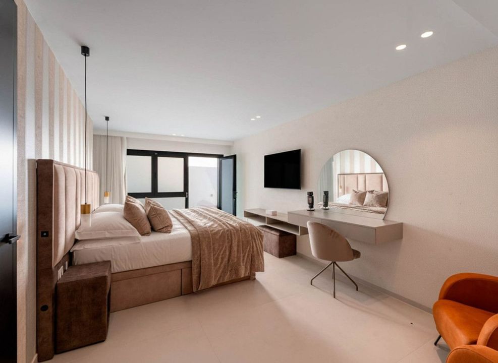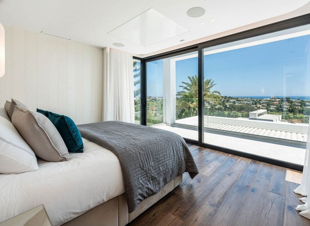 De villa beschikt over zes slaapkamers, allemaal met en-suite badkamers die privacy en comfort waarborgen. De primaire suite biedt uitzicht op zee en toegang tot een privéterras. De bovenste verdieping omvat een solarium met jacuzzi en panoramische uitzichten van de golfbaan tot Afrika, een rustige plek om het uitzicht te waarderen.