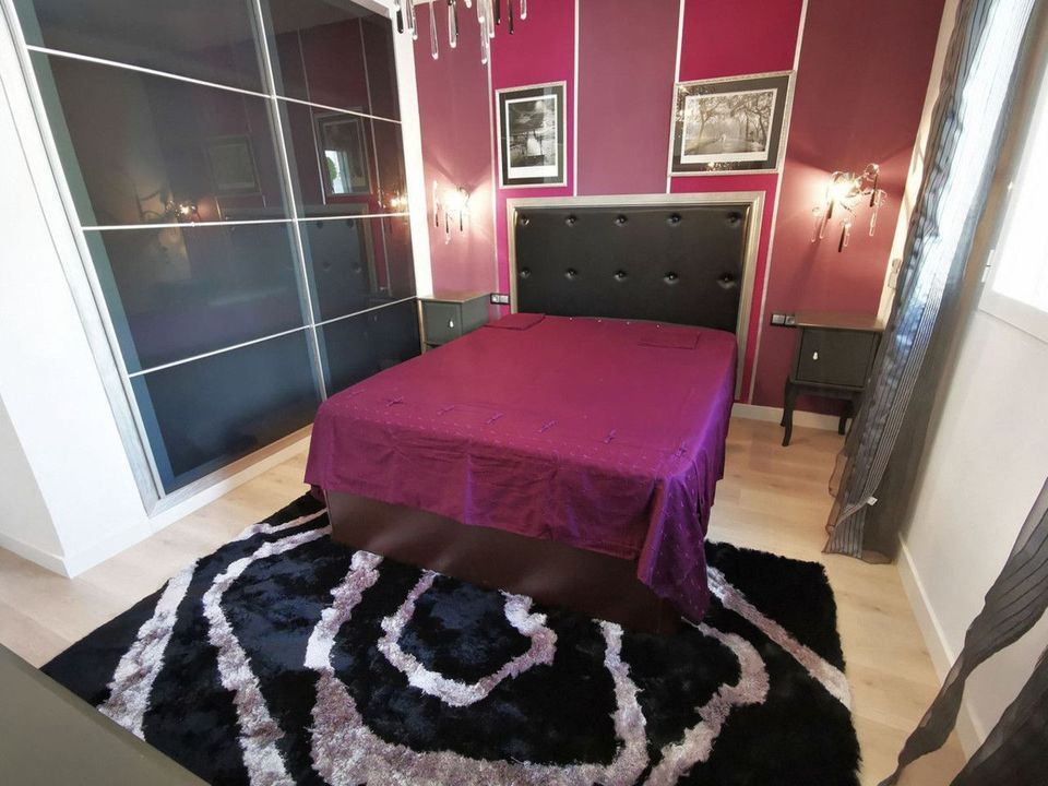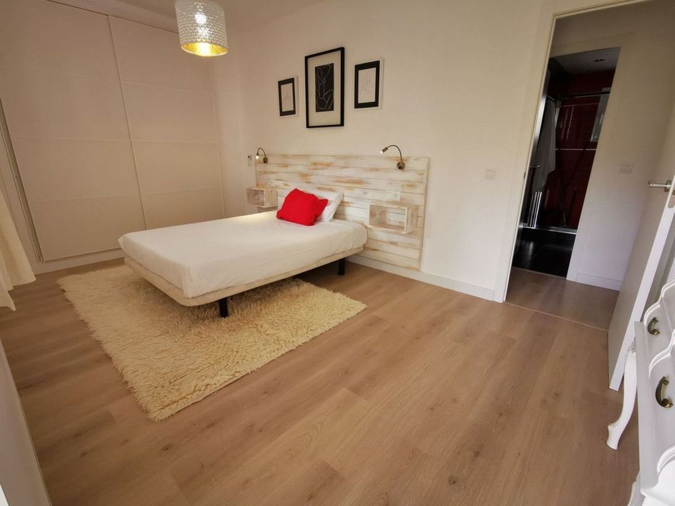 The wooden floors add warmth and elegance to the space, whilst the pre-installation for a fireplace in the living room will allow you to create a cosy atmosphere during the cooler months. It also features fitted wardrobes and air conditioning for your comfort. The residential complex offers spacious gardens and a communal swimming pool, ideal for relaxing and soaking up the sun.