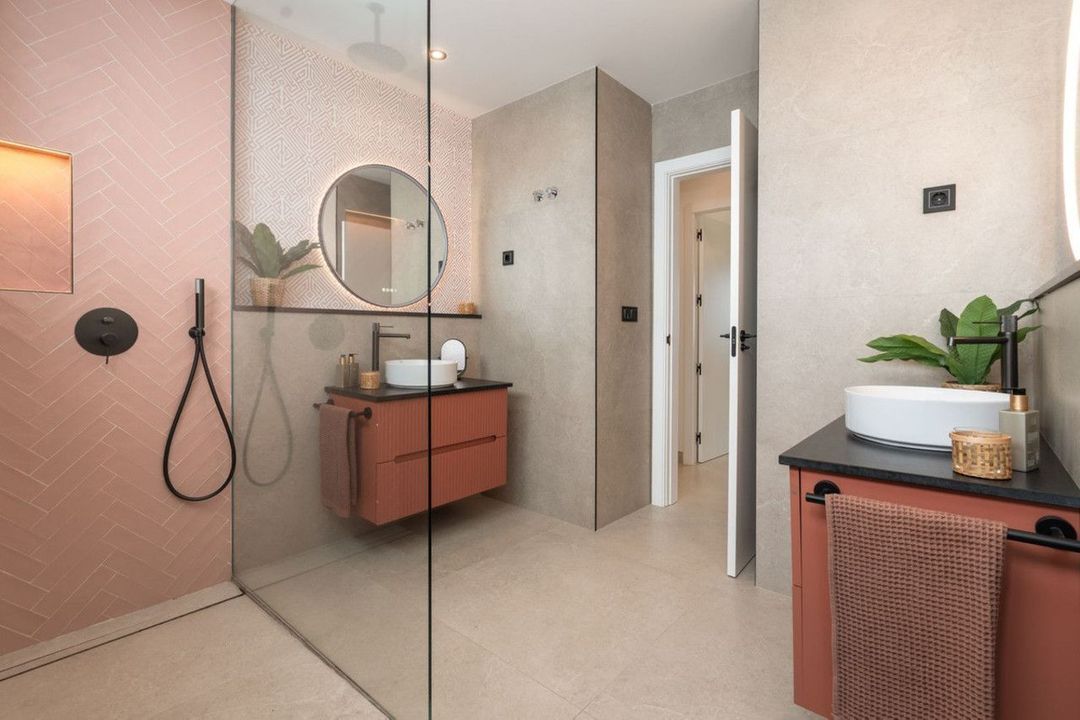 En-suite badkamer: Elegant design met dubbele wastafel, grote inloopdouche, toilet en op maat gemaakte opbergruimte.
