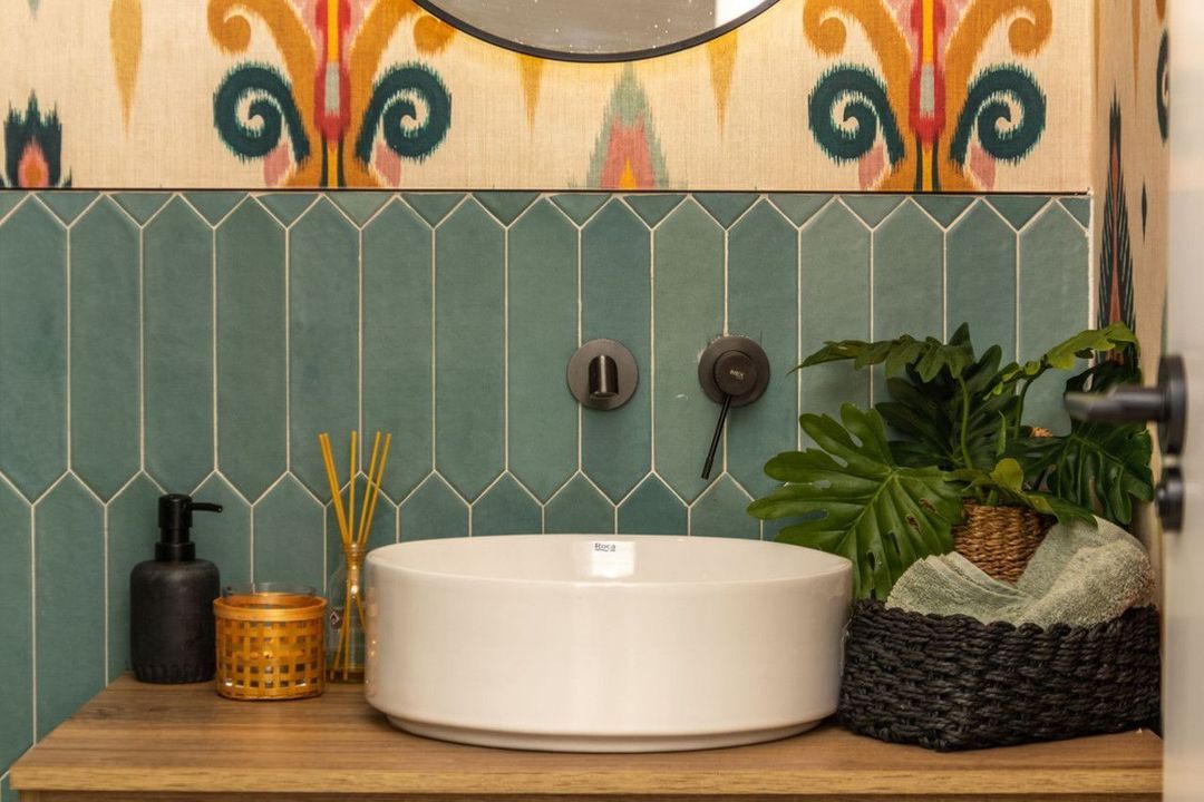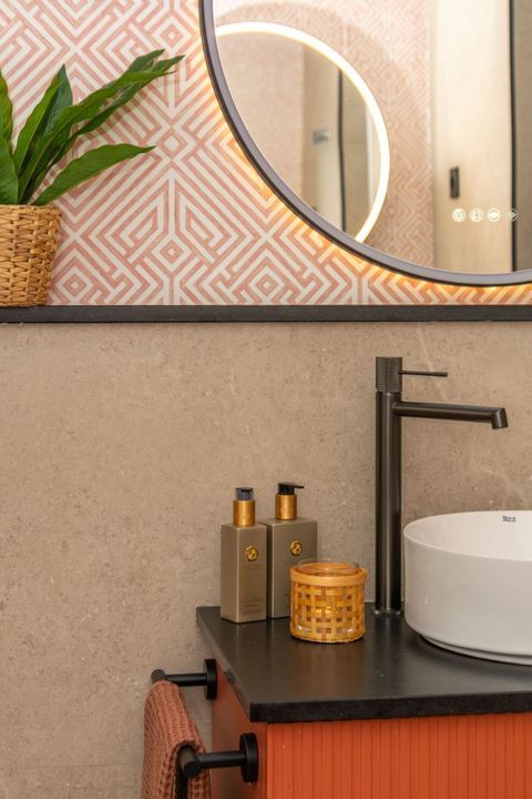 Badkamer: Stijlvolle badkamer met inloopdouche, wastafel, toilet en opbergruimte.