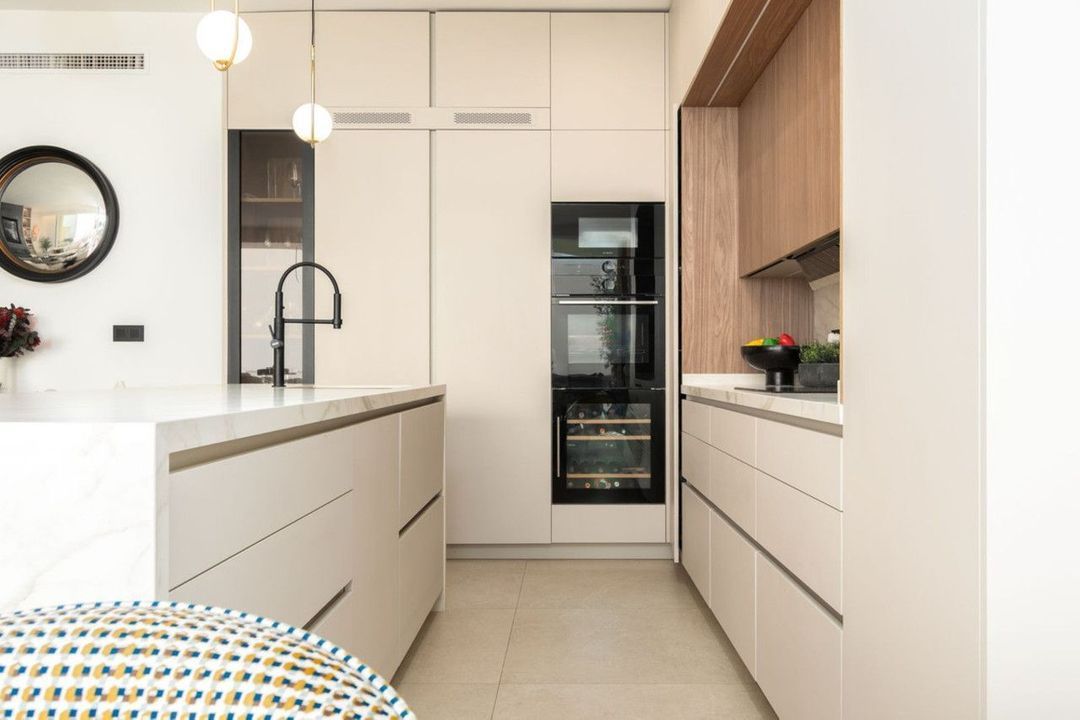 Keuken: Op maat gemaakte open keuken van superieure kwaliteit, volledig uitgerust met hoogwaardige apparatuur, waaronder een koelkast/vriezer, oven, magnetron, vaatwasser en wijnkoeler.