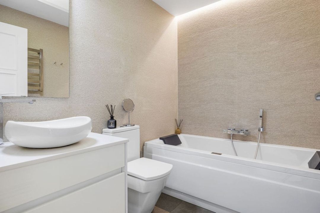 Inside, the apartment is clean and intentional. The three bedrooms are spacious, featuring floor-to-ceiling built-in wardrobes, while the two bathrooms—including a master en-suite with a full bath—are finished to a sharp, modern standard. A separate kitchen keeps the utility of the home tucked away from the main living area.