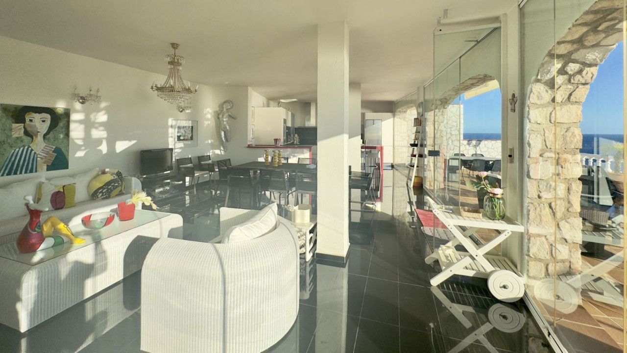 The main living floor features a bright and spacious living room opening onto a large glazed terrace with stunning sea views, a dining area and a fully equipped independent kitchen.