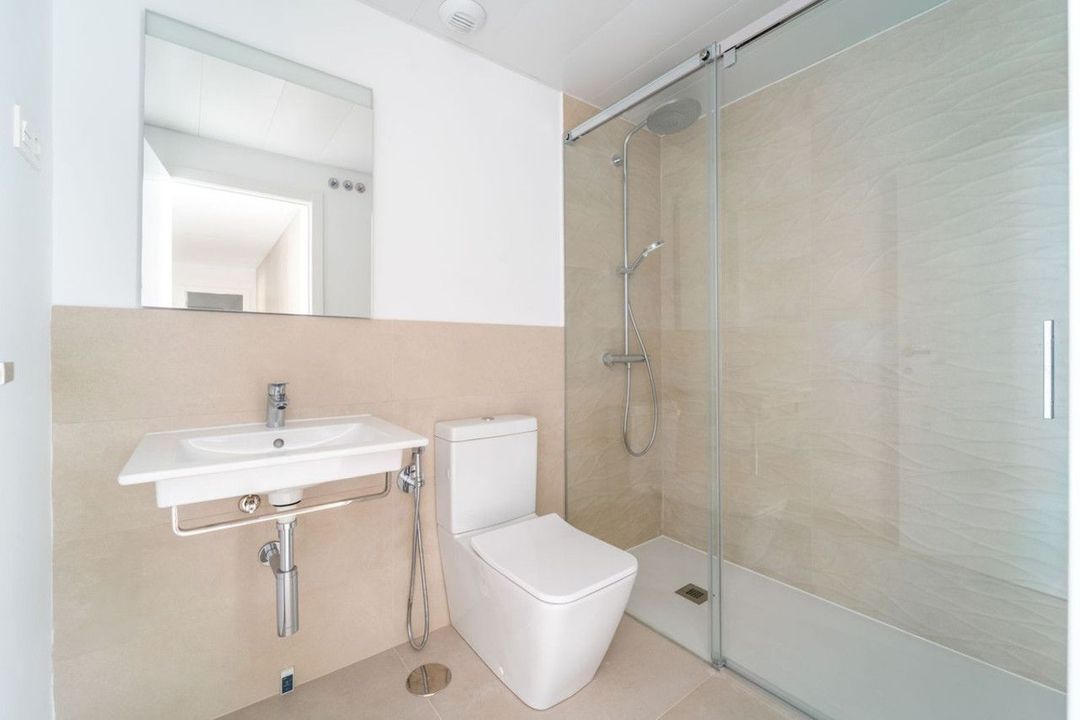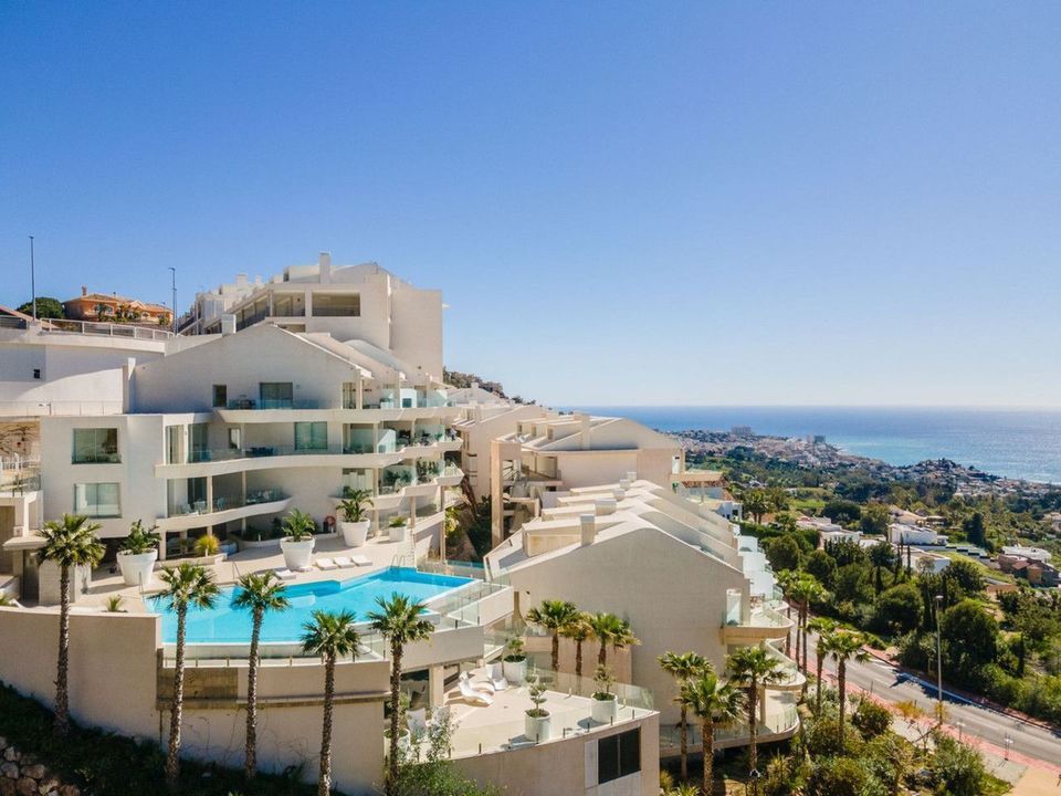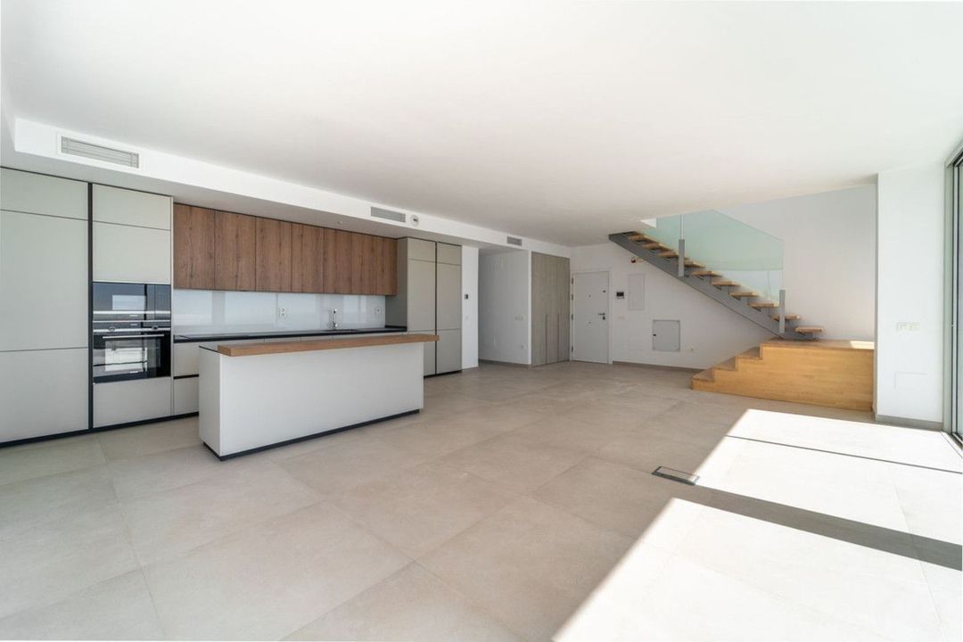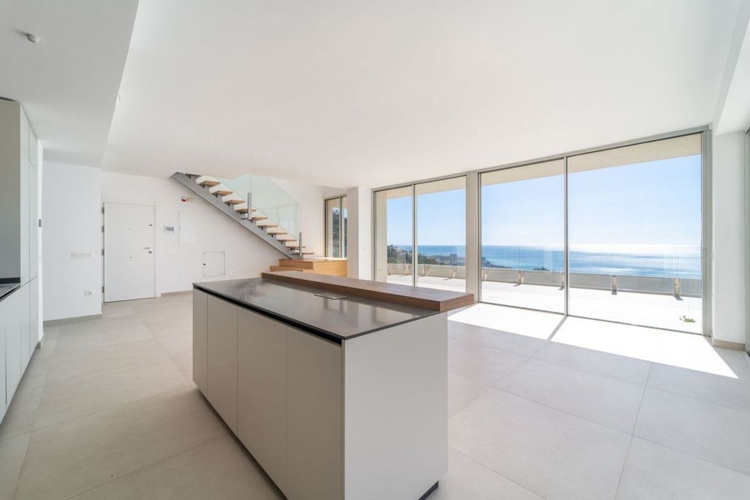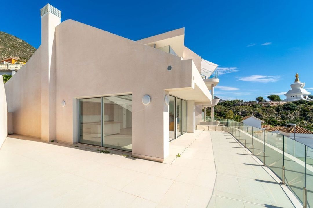 Brand new south facing penthouse duplex, located in the exclusive urbanization of Stupa Hills. The property consists of hall, 3 bedrooms with built-in wardrobes and electric blinds, bathroom and guest toilet, open plan kitchen fully furnished and equipped with electricial appliances from Siemens. Spacious living-dining room that leads out to a terrace of 65m2 with panoramic sea views, the Fuengirola Bay and of the Buddist Temple. On the top floor is located the main bedroom with walk-in closet, ensuite bathroom and laundry area. The bedroom leads out to a terrace of 21m2 with panoramic sea views. Air conditioning hot and cold with Airzone, video intercom, domotic system, pre-installation alarm system. Includes two parking spaces and one storage room.