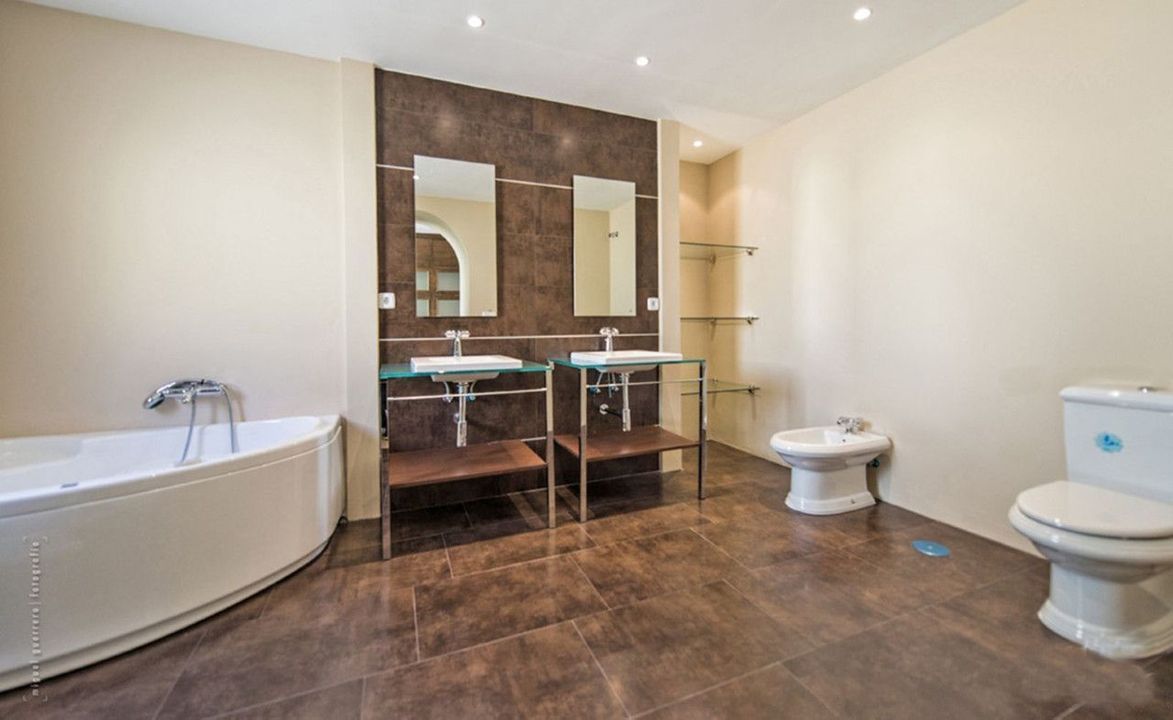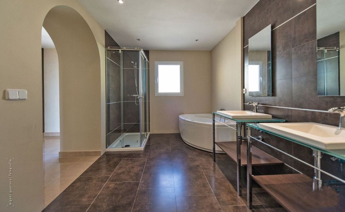 It has 4 big bedrooms, all of them with en suite bathrooms, the master one with walking dressing room, a well equipped kitchen, a dining room, a large living room with a fire place, a covered terrace, a guess toilette, a closed garage for 1 car, a big parking space for 4 cars, and a large patio with a swimming pool.