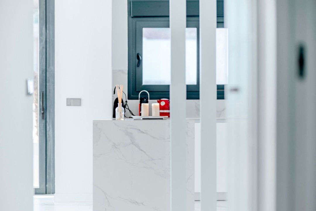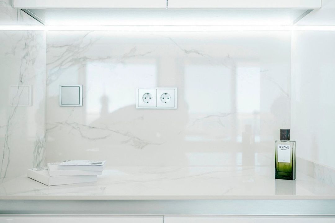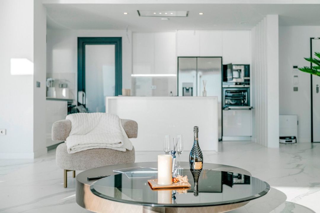 De ruime woonkamer baadt in natuurlijk licht en beschikt over een open keuken met hoogwaardige Samsung smart-apparatuur en exclusieve Porcelanosa afwerkingen. Dankzij het naadloze ontwerp en de premium materialen is deze ruimte perfect voor zowel dagelijks gebruik als entertainment.