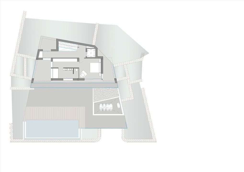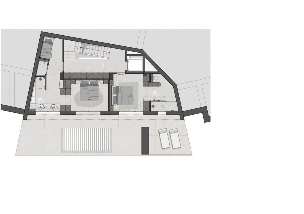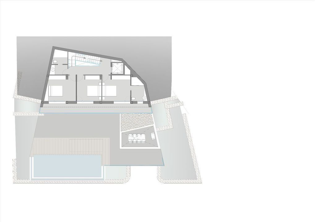 De bovenste verdieping bestaat uit de master bedroom met en-suite badkamer, dressing en een privéterras op het zuidoosten. Eén etage lager bevinden zich drie slaapkamers, waarvan één met eigen badkamer. De overige twee delen een tweede badkamer. Alle kamers hebben toegang tot het terras met uitzicht op zee. De woonverdieping beschikt over een riante woonkamer, eetgedeelte en open keuken met werkeiland en bijkeuken. Op dit niveau ligt het zwembad (9,60 m x 3,20 m) met zonneterras en een overdekte veranda, ideaal voor een eethoek en loungegedeelte. Op het laagste niveau bevindt zich een bodega, een toilet en verschillende ruimtes die naar wens kunnen worden ingericht. Alle verdiepingen zijn bereikbaar via een lift en interne trap.